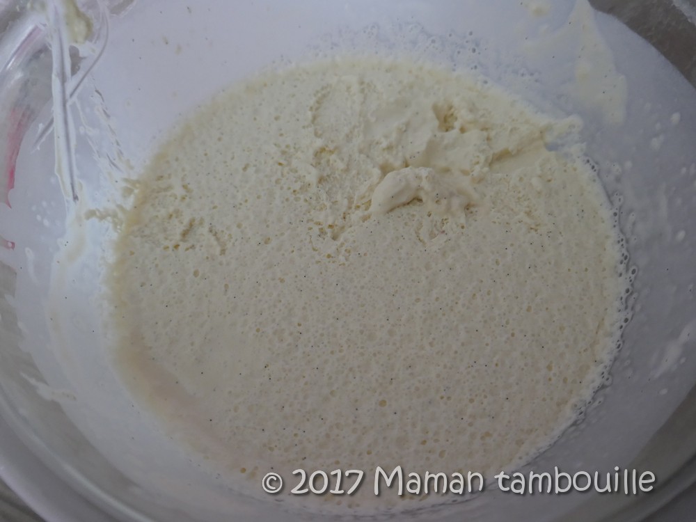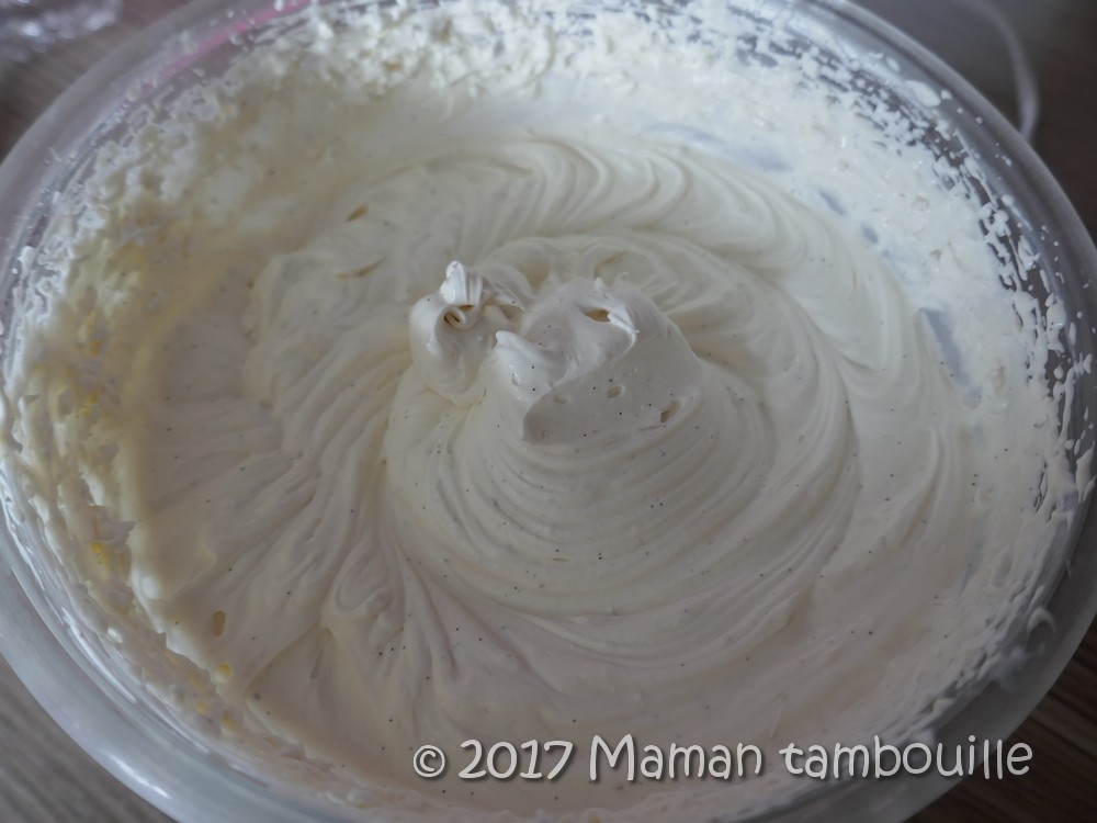 Commencer à fouetter la crème au batteur à vitesse lente puis monter la vitesse. Fouetter jusqu’à obtenir une chantilly ferme. Dès que la chantilly est bien ferme, on arrête de fouetter au risque de faire grainer la crème et d’obtenir du beurre !