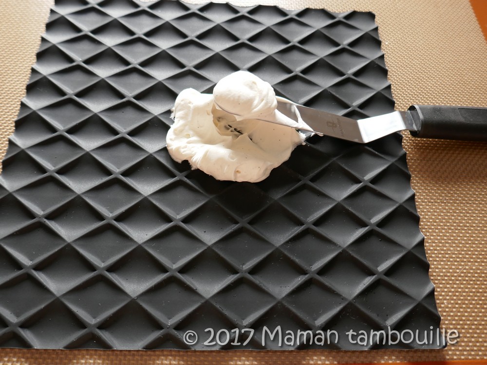 Mettre 2 cuillères à soupe de crème montée sur la plaque et étaler avec une spatule coudée. Il faut bien veiller à couvrir toute la plaque et à lisser en plusieurs passages pour bien boucher tous les trous. Au besoin, ne pas hésiter à rajouter de la crème et retirer le surplus à la fin.