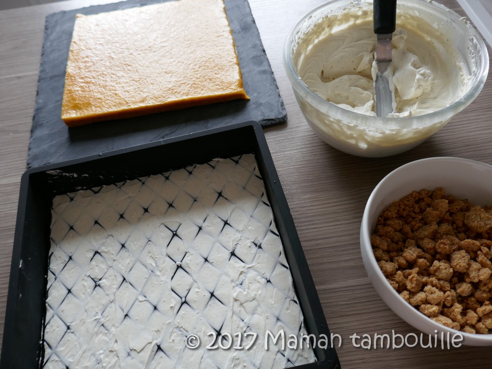 Déposer sur le streusel l’insert de pain d’épices bien centré et en mettant la face compotée sur le streusel. Appuyer doucement pour « lier » le tout. (Désolée, j’ai zappée cette photo intermédiaire, surement perturbée par le fait que j’avais déjà compris que je n’aurai pas assez de mousse).