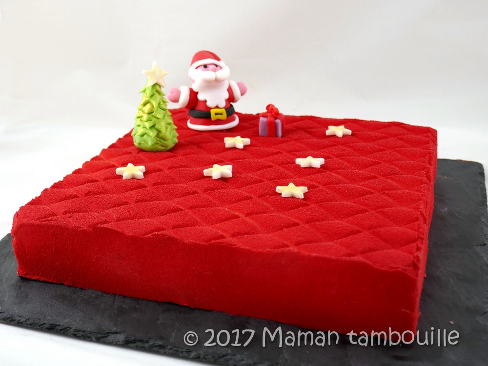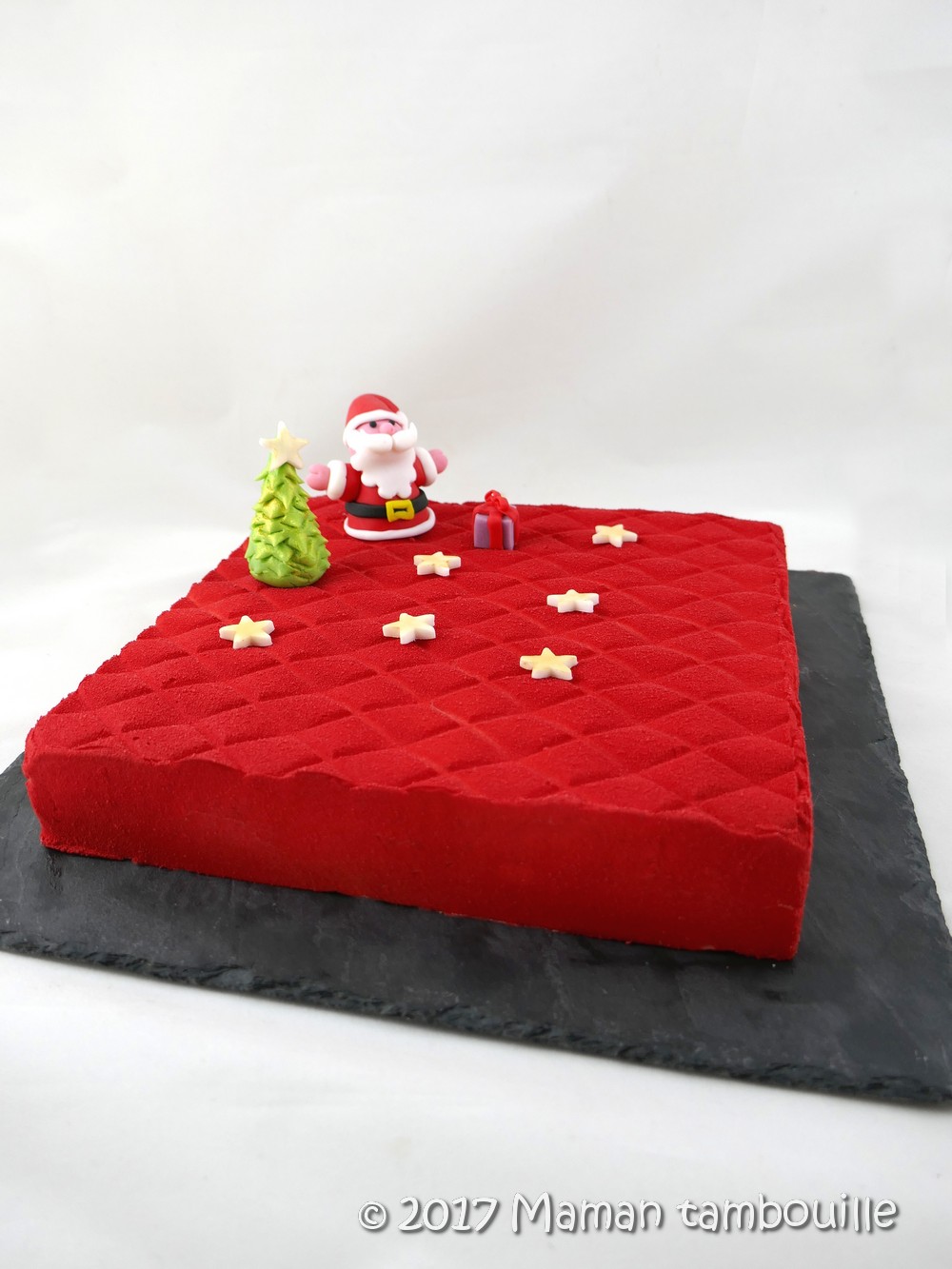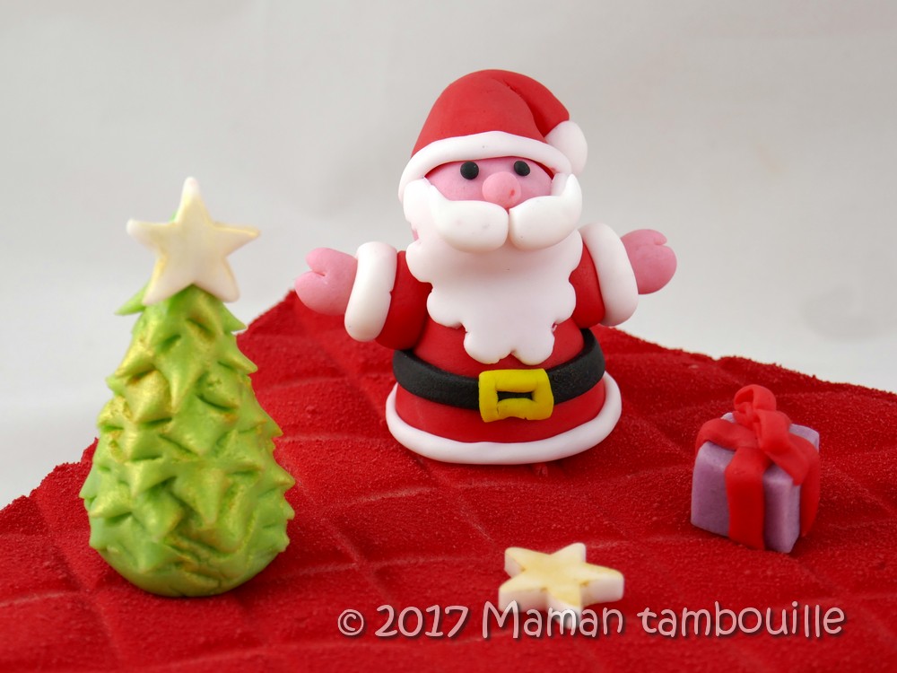 Au dernier moment, décorer le gâteau avec quelques décors en pâte à sucre. J’ai fait un père Noël, un sapin, un cadeau et des étoiles que j’ai poudrées de poudre couleur or.