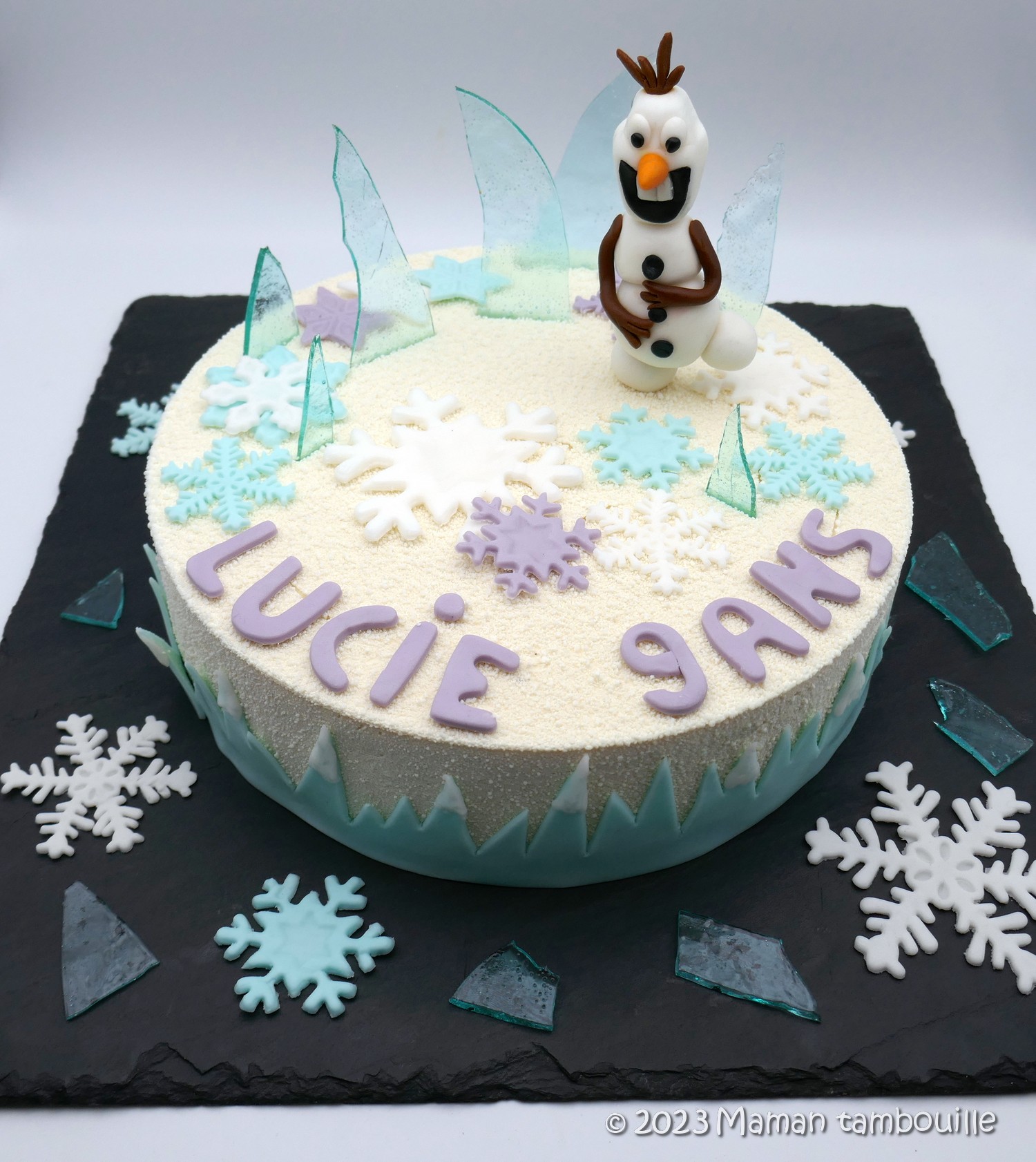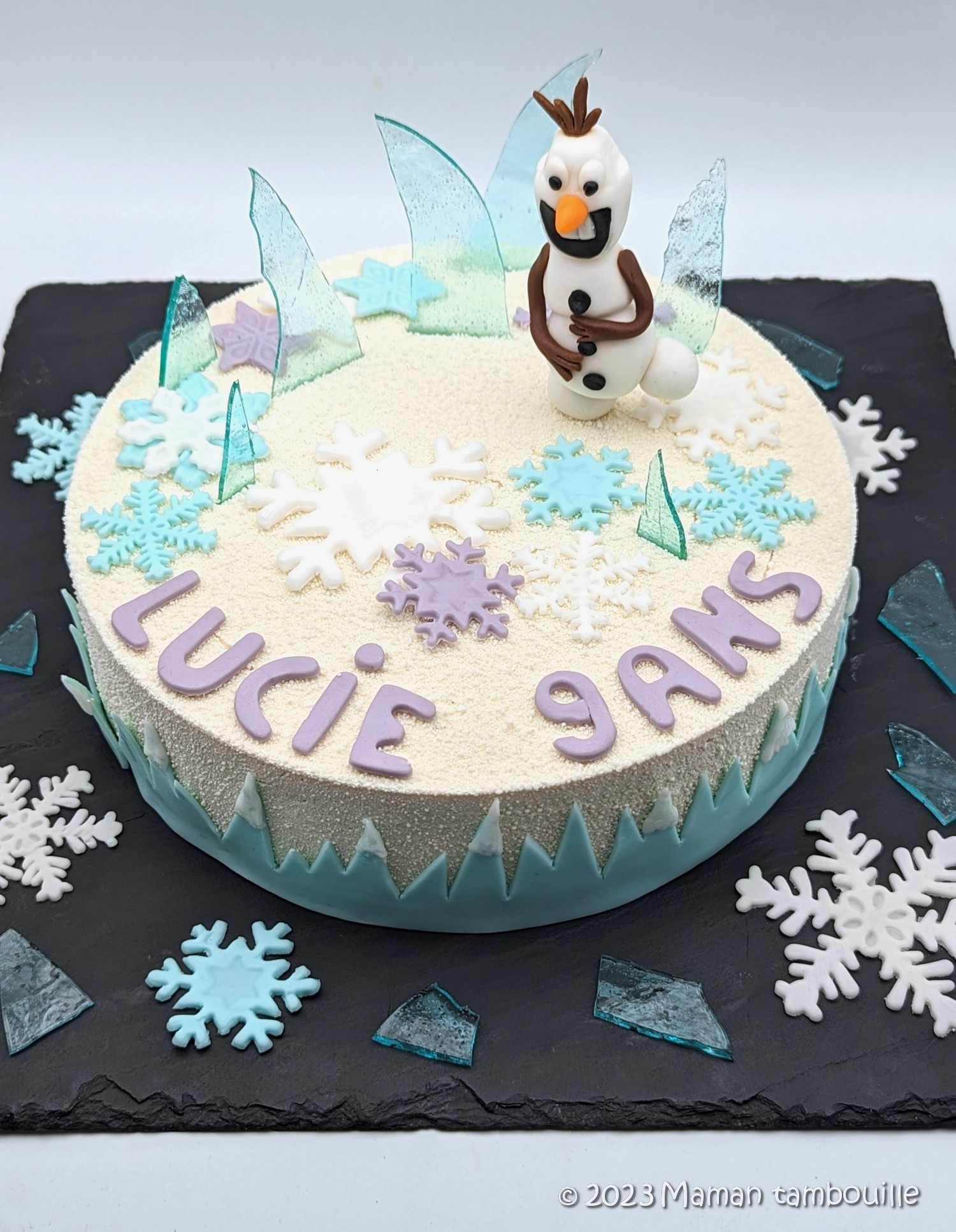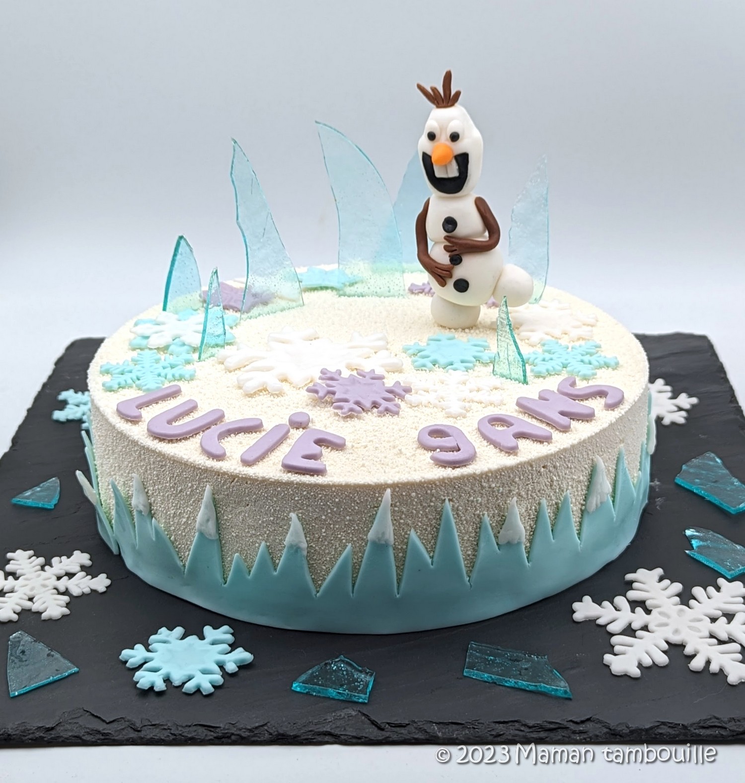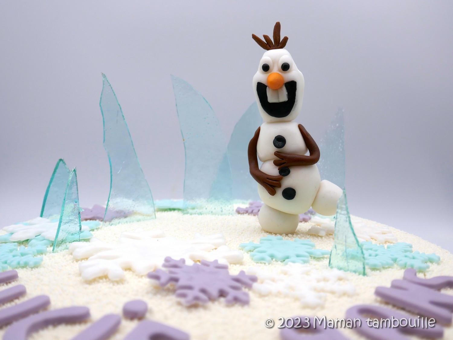 Le plus proche possible du service, décorer le gâteau avec la pâte à sucre et les morceaux de glacier.
