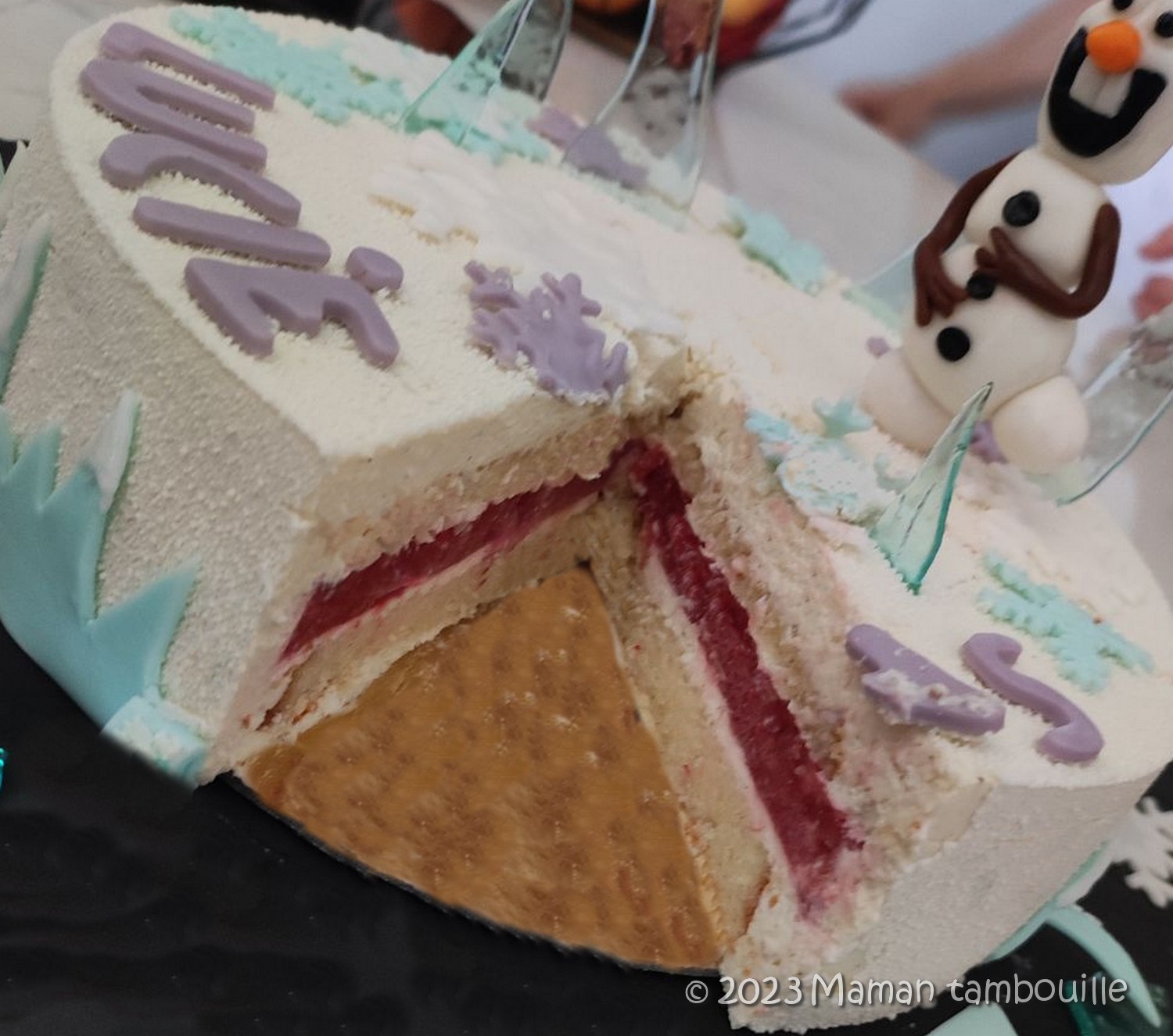 La demande: le thème reine des neiges et des saveurs de fraise. Je me suis basée sur cette recette Fraisier facile et léger que j’avais déjà réalisée et adorée mais j’ai remplacé les fraises fraîches par un insert de compotée de fraise. Pourquoi pas de fraises fraîches ? Et bien parce que les fraises fraîches ne supportent pas la congélation et que je ne pouvais pas préparer ce gâteau au dernier moment. Un problème, une solution 😉