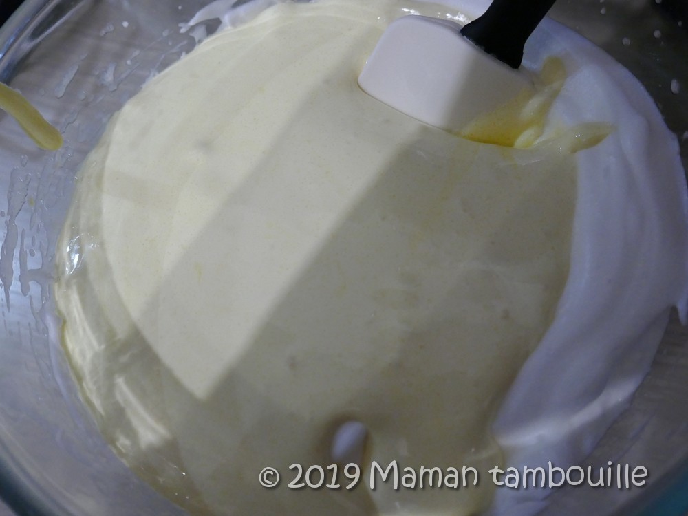Ajouter la farine tamisée et incorporer délicatement avec la spatule.
