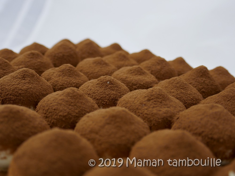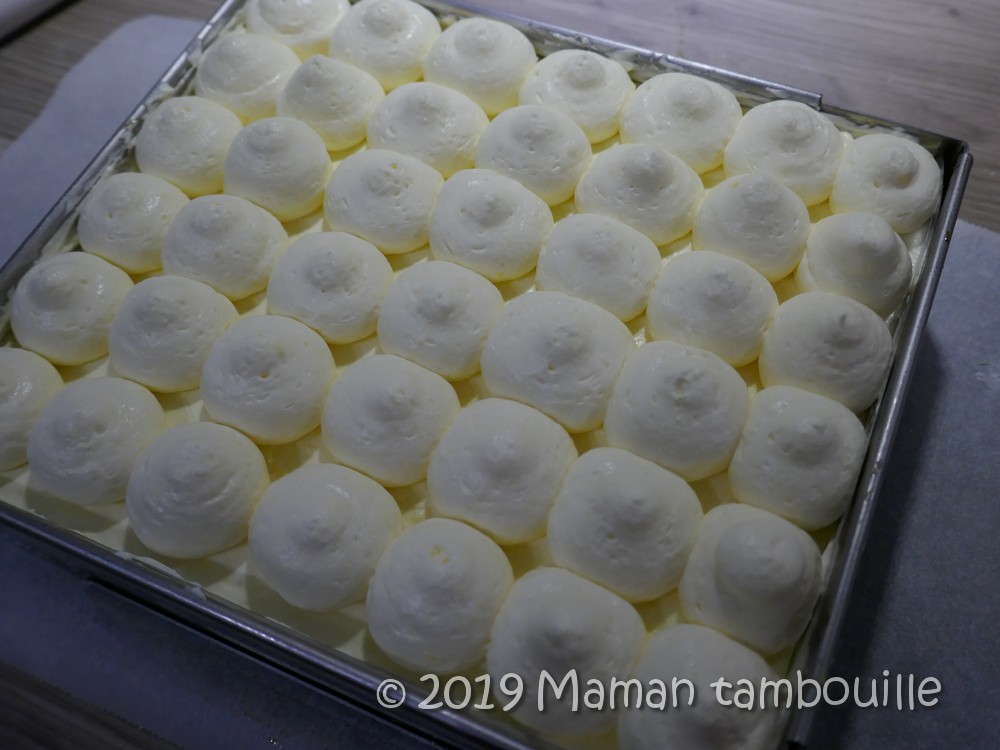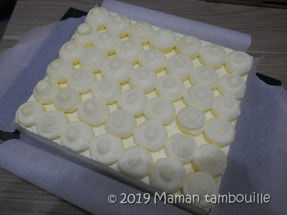 Couvrir d’une couche de crème assez fine (juste de quoi entourer le biscuit du milieu et le couvrir légèrement sur le dessus). Mettre le reste de crème dans une poche à douille. Former de belles boules de crème sur tout le gâteau.