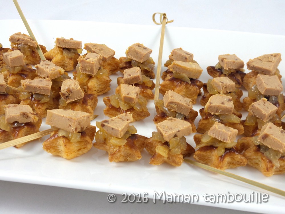 Aujourd’hui, c’est encore une recette de fêtes qui va nous faire oublier le temps gris et triste avec des petites étoiles feuilletées surmontées d’une touche d’oignons confits et d’un morceau de foie gras … une nouvelle idée pour l’apéritif.