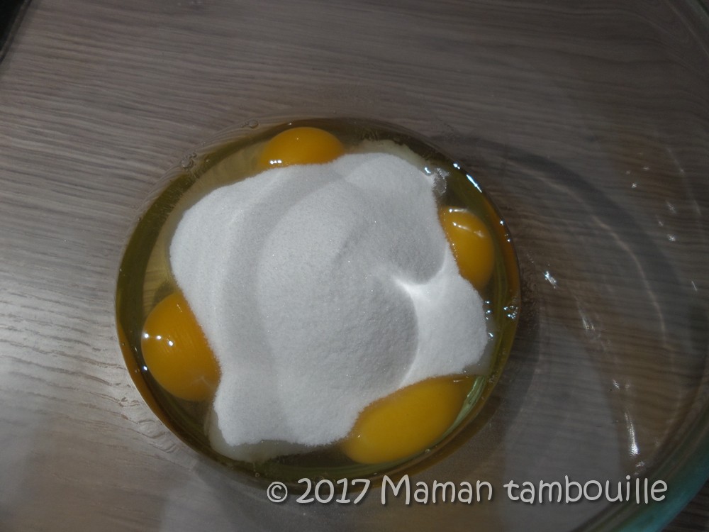 Dans le cul de poule, casser les œufs et ajouter le sucre.