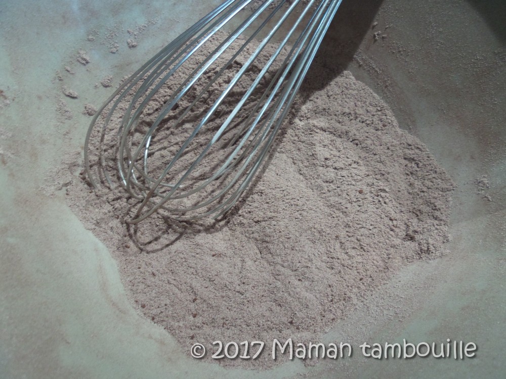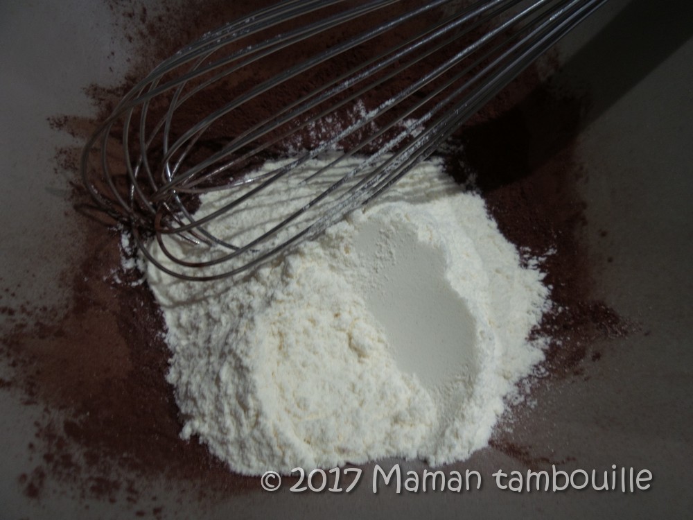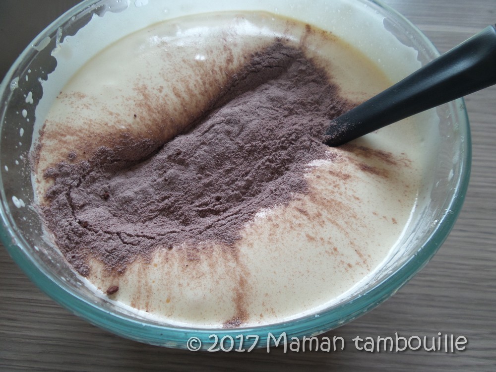 Verser le mélange farine/cacao en 3 fois en mélangeant avec une spatule entre chaque ajout.