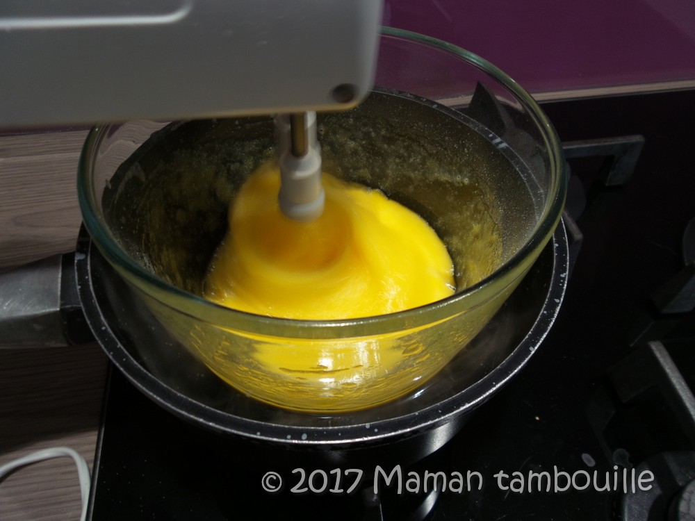 Poser le cul de poule dans la casserole d’eau frémissante et battre au batteur électrique vitesse moyenne. Continuer de battre jusqu’à ce que la température atteigne 50°.