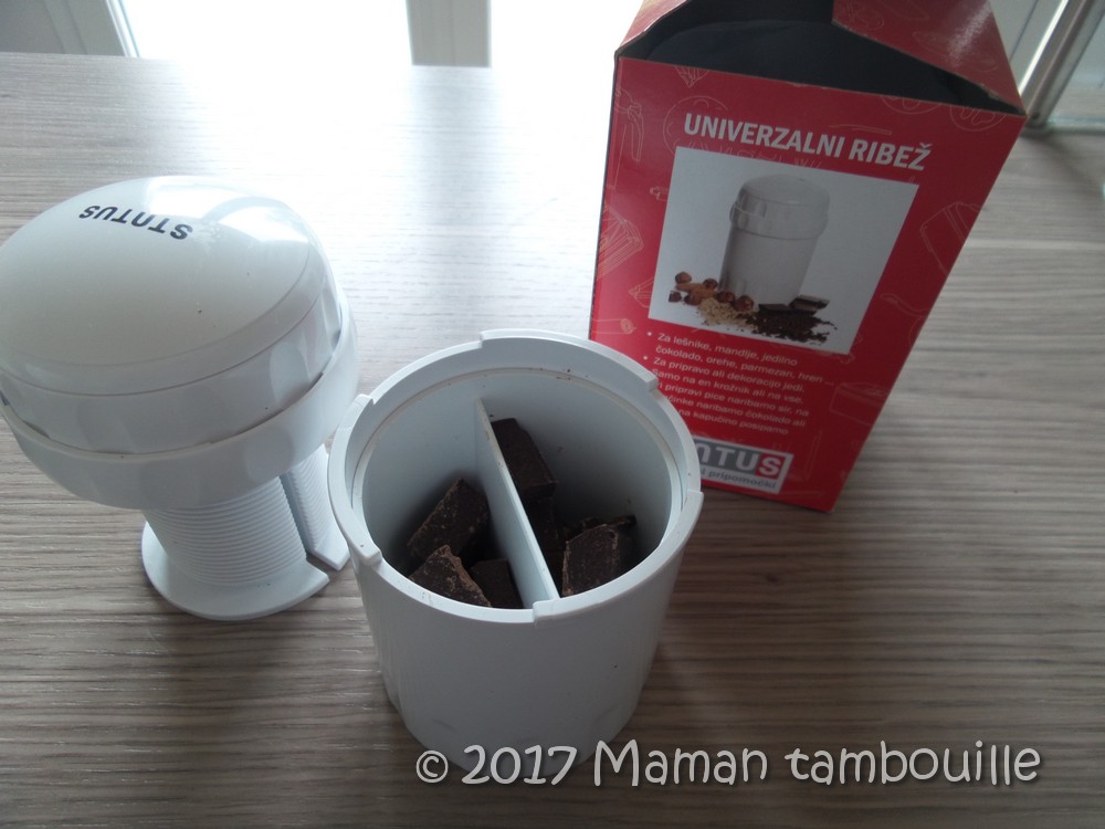 Pendant ce temps, râper le chocolat noir (j’ai utilisé le moulin universel Airlock) ou le couper en petits morceaux.