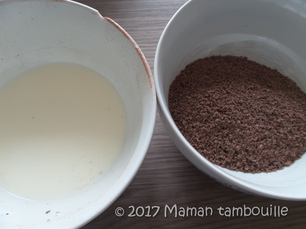 Verser 50g de crème liquide dans un bol et la chauffer. Verser 1/3 de crème bouillante sur le chocolat râpé (si le chocolat n’est pas râpé, le faire fondre au préalable) et mélanger avec une cuillère. Verser ensuite un autre tiers et mélanger puis le reste de crème.