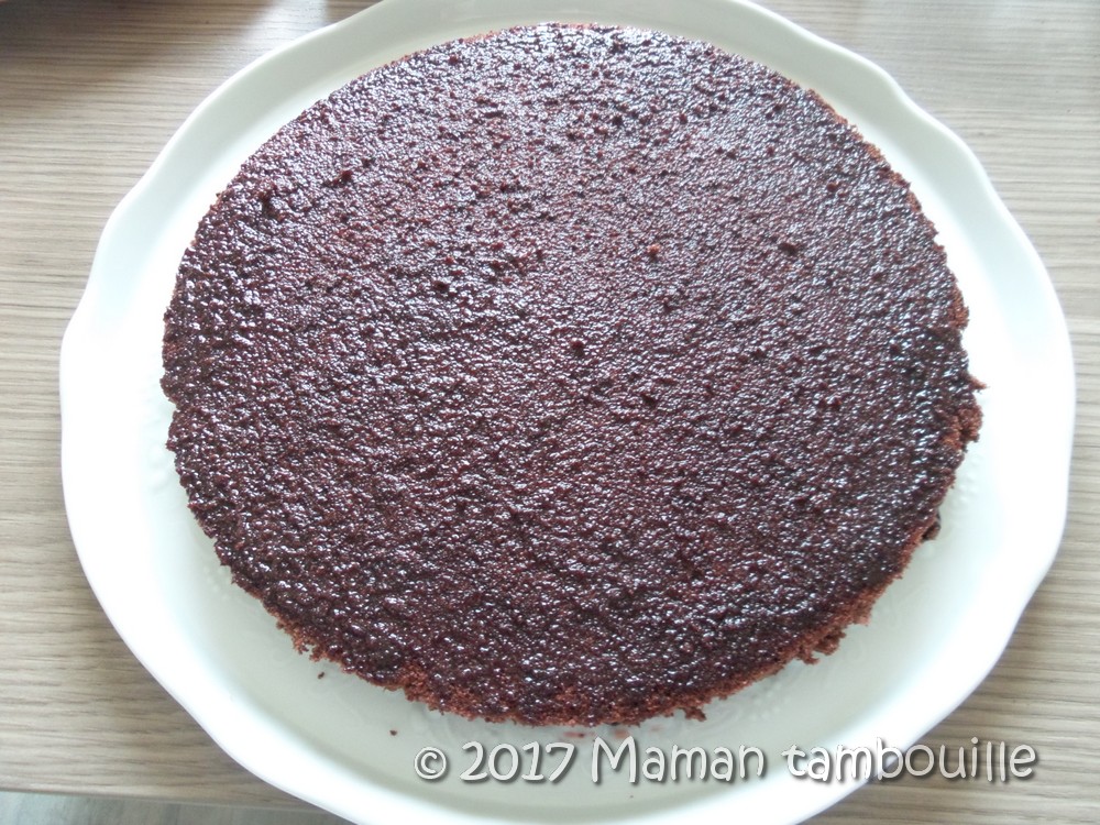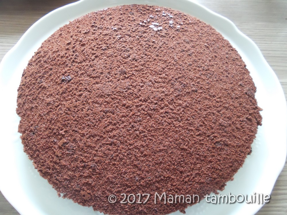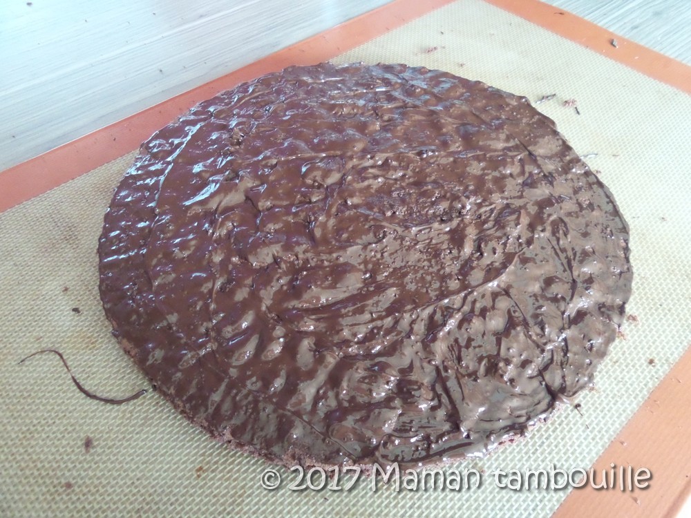 Quand le chocolat est dur, retourner la génoise sur un plat.
