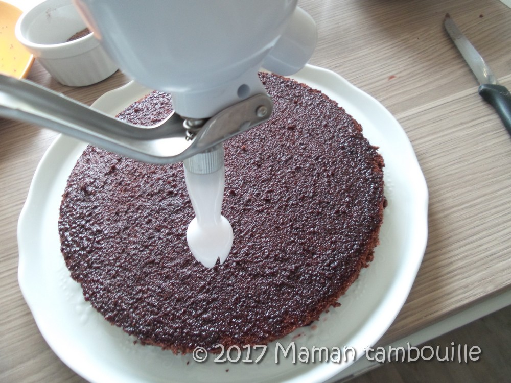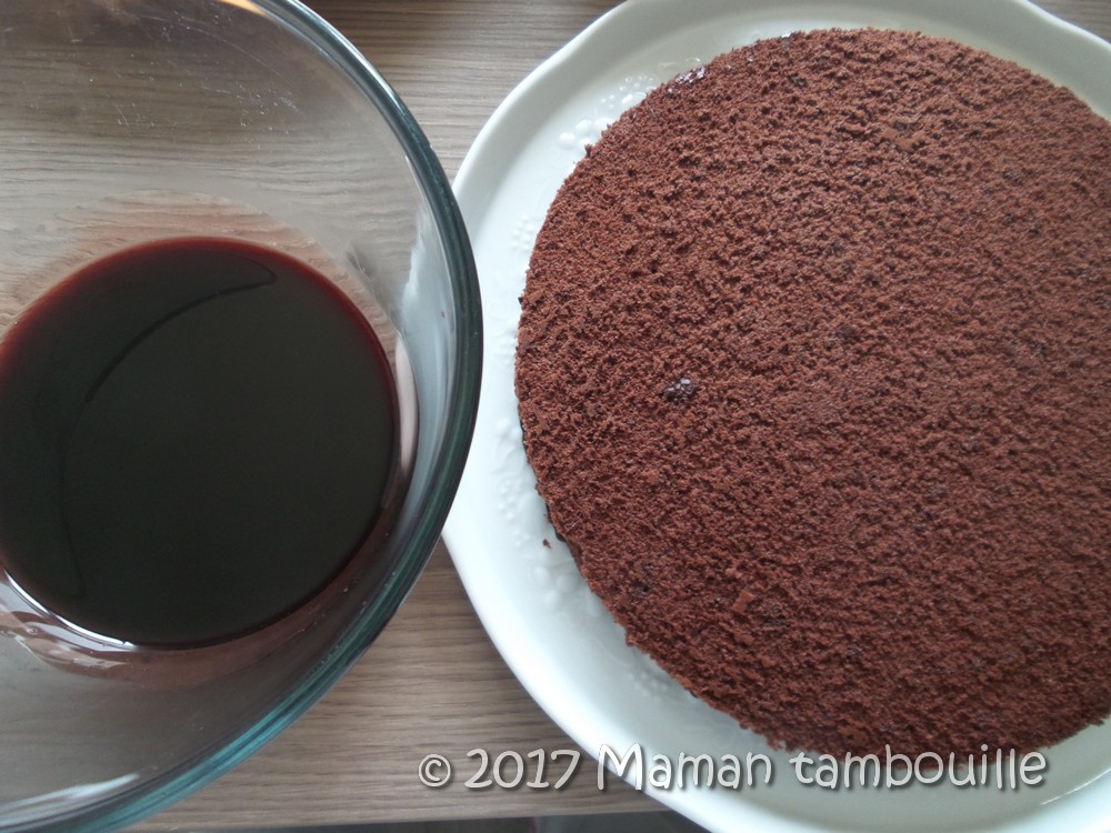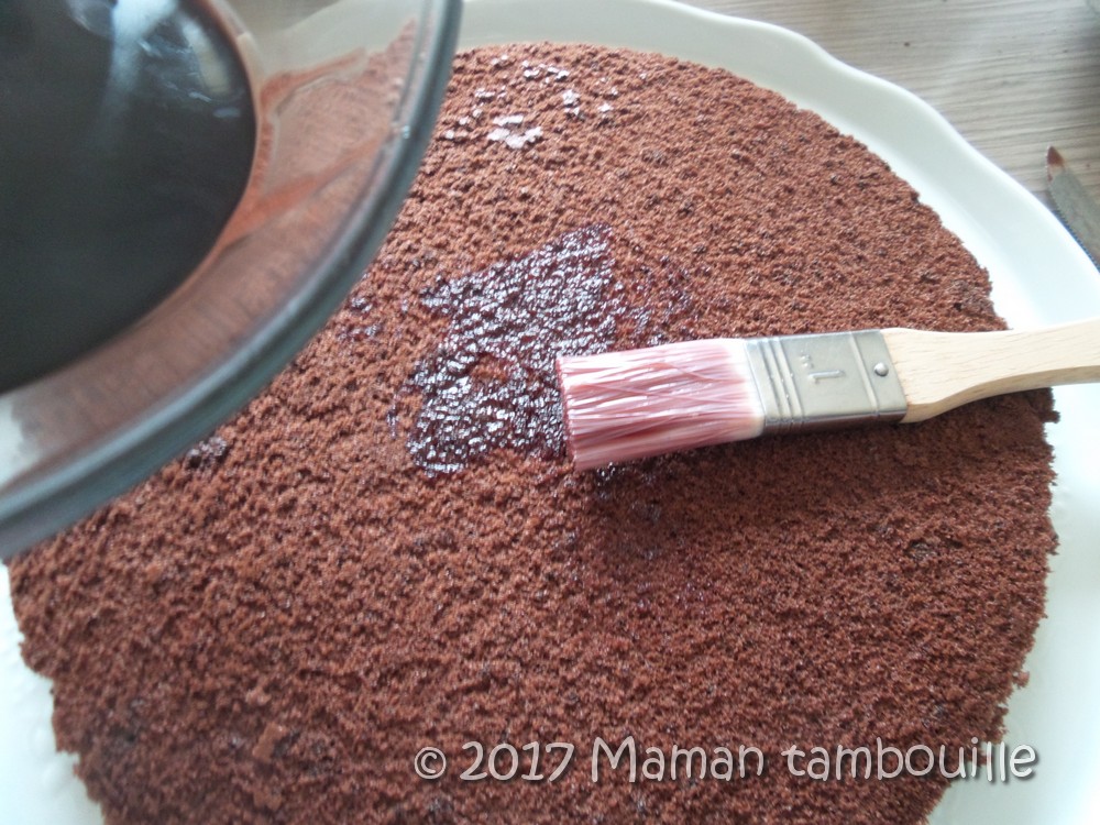 Verser le sirop au fur et à mesure sur la génoise et étaler au pinceau. On doit mettre tout le sirop et on veut qu’elle soit bien imbibée. Si vous aimez, vous pouvez rajouter 2 cuillères à soupe de kirsch dans le sirop avant de le verser (perso, je n’aime pas).