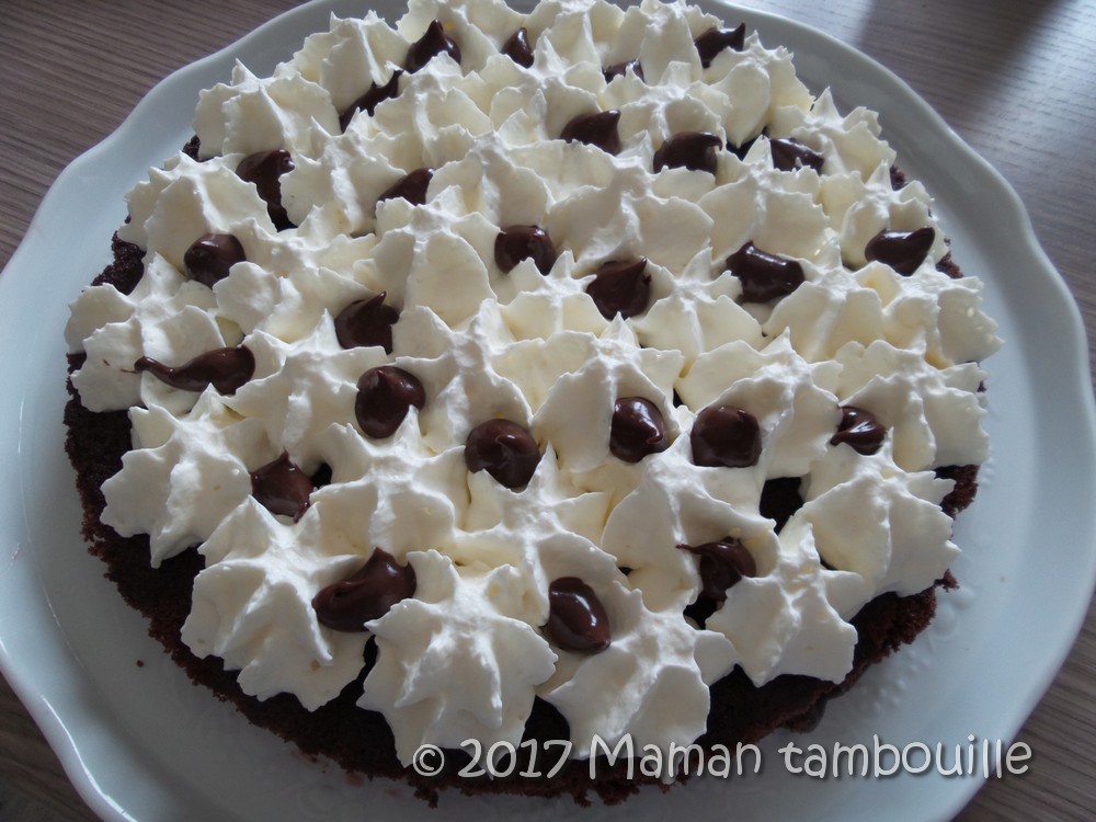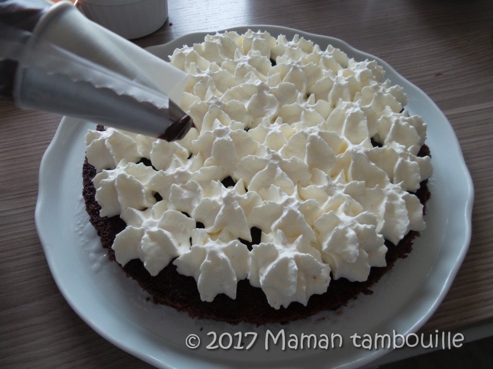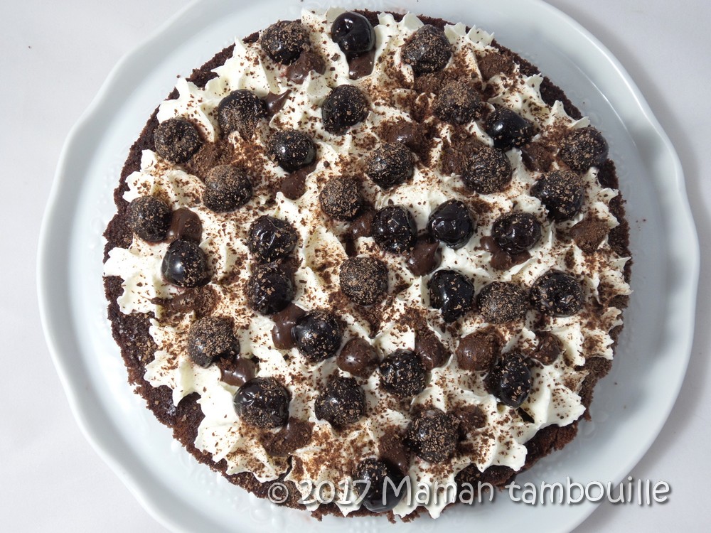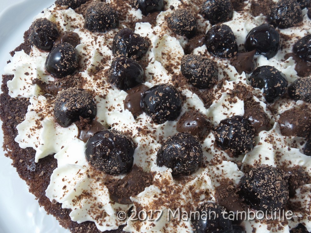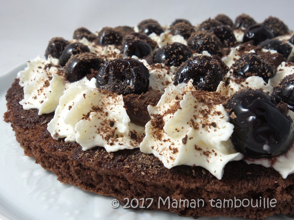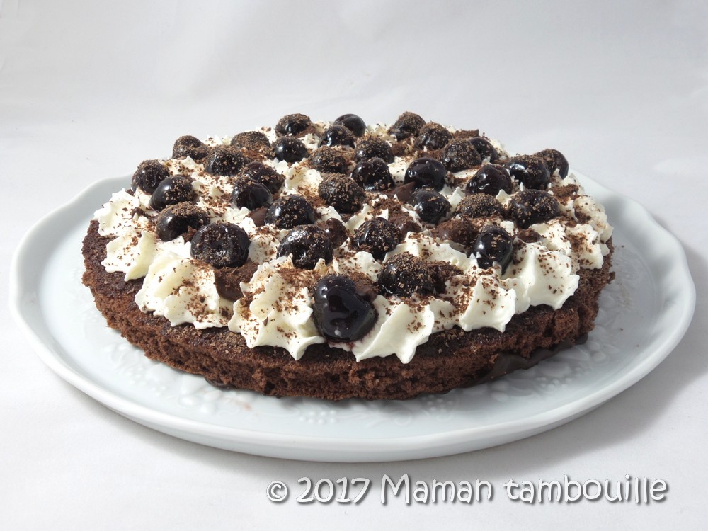 Pour en revenir à la recette, il s’agit d’un gâteau type fantastik de Michalak soit, une base moelleuse sur laquelle on poche plusieurs préparations puis on garnit de topping au choix. Ici, c’est une base de génoise au chocolat (j’ai fait ma première génoise !) imbibée de sirop d’amarena, une chantilly au mascarpone, des pointes de ganache au chocolat et des cerises amarena. Le tout donne une forêt noire revisitée bien sympa et que je trouve moins écœurante de la traditionnelle forêt noire à étages. Ma tribu a beaucoup aimé, surtout loulou 2 qui, une fois n’est pas coutume, en a mangé une grosse partie à lui tout seul !