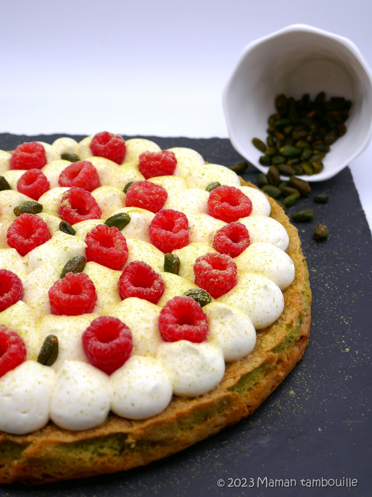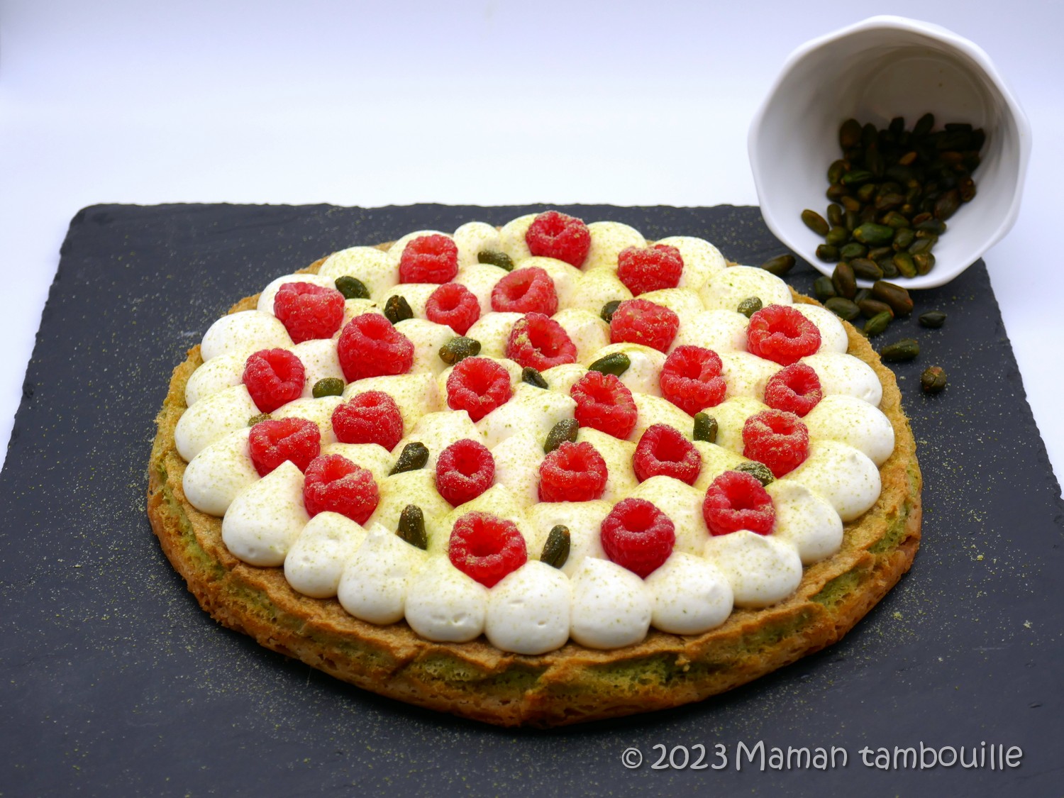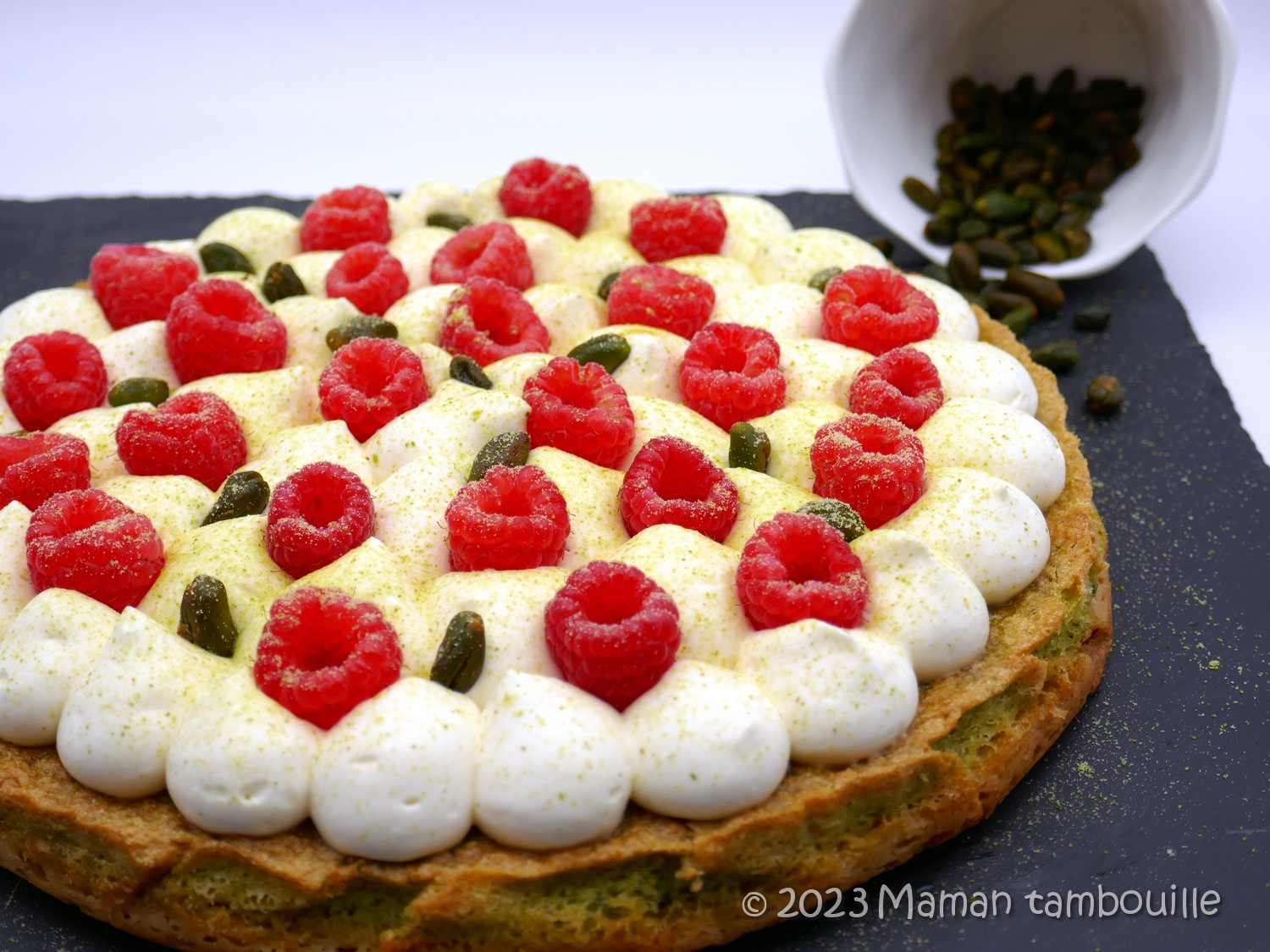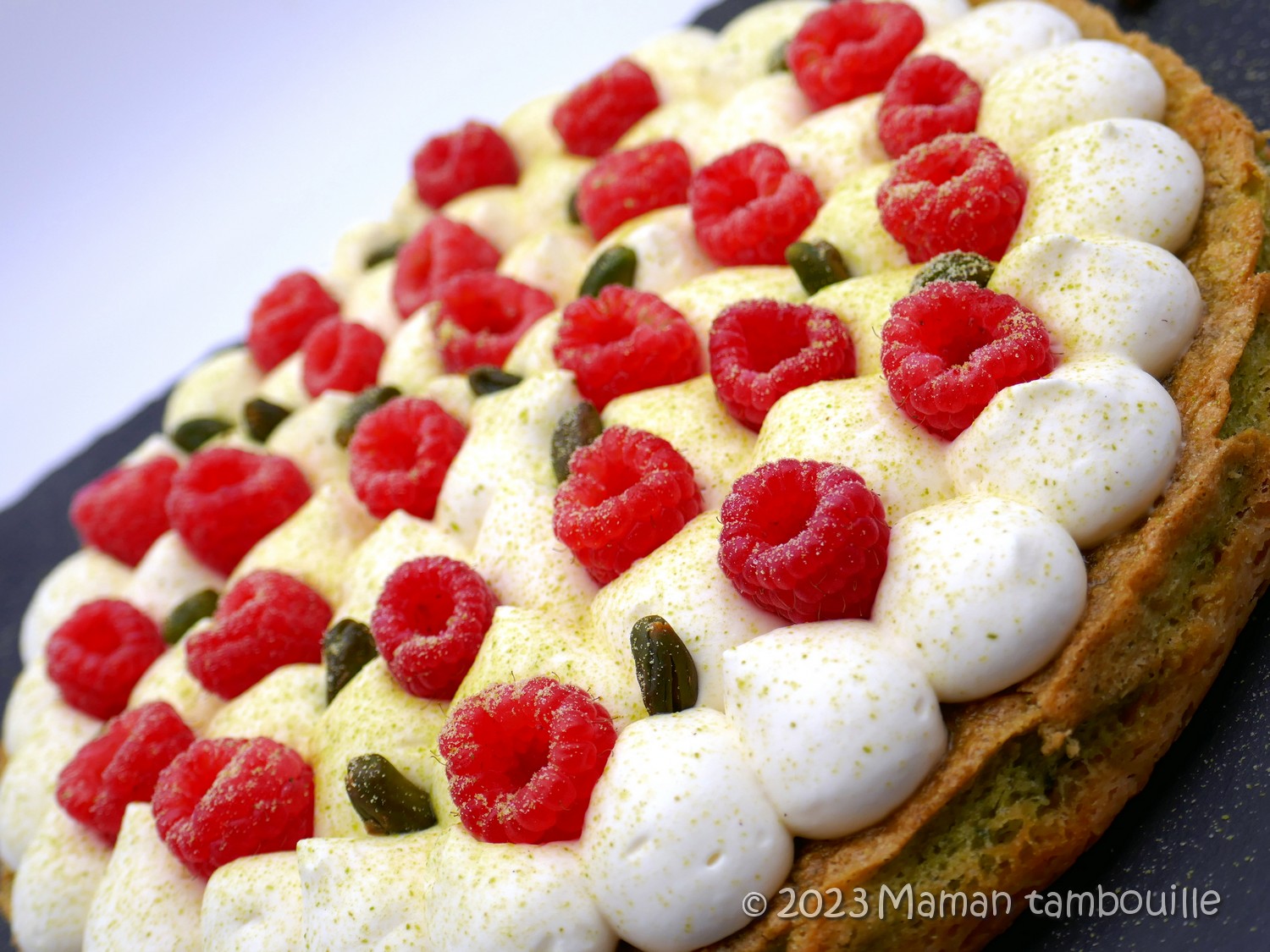Je suis partie sur l’idée d’un fantastik avec: une base sablée, un biscuit moelleux à la pistache et imbibé d’un sirop fleur d’oranger, une ganache montée fleur d’oranger et enfin, quelque framboises fraîches pour la finition.