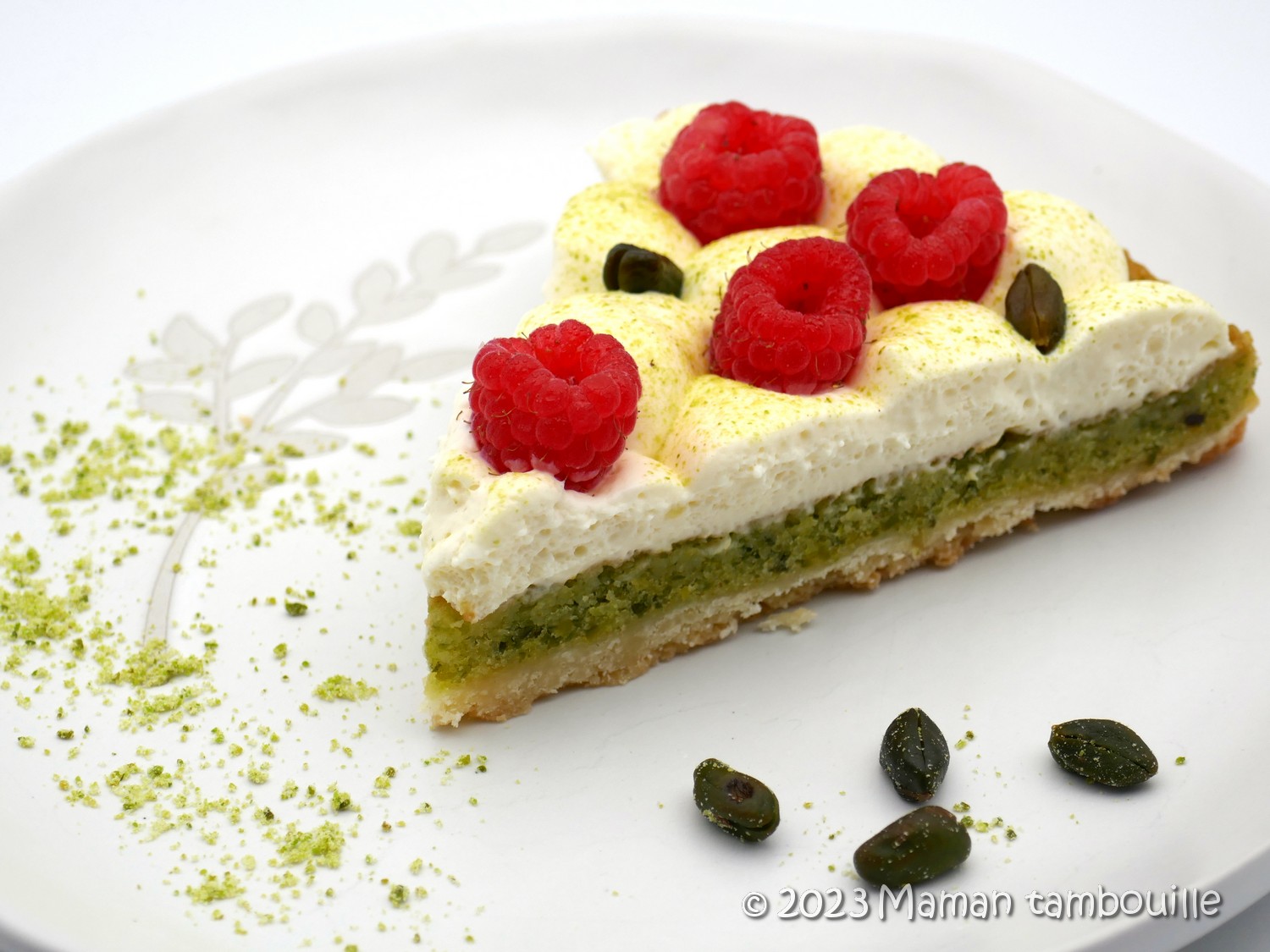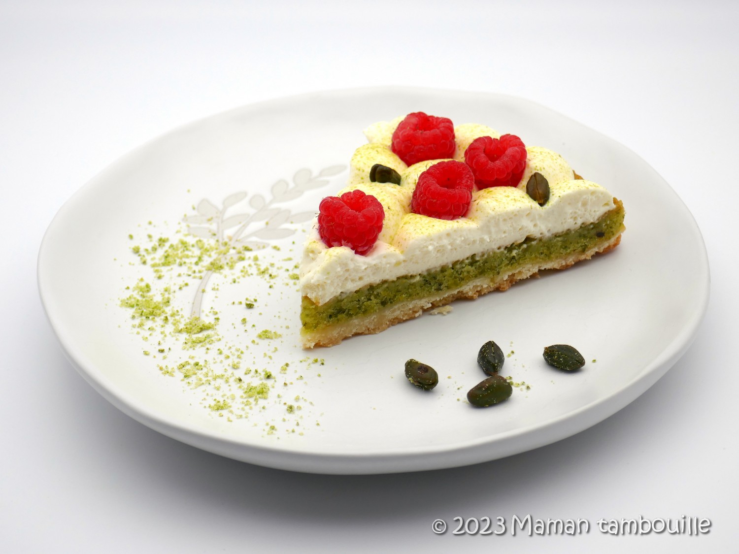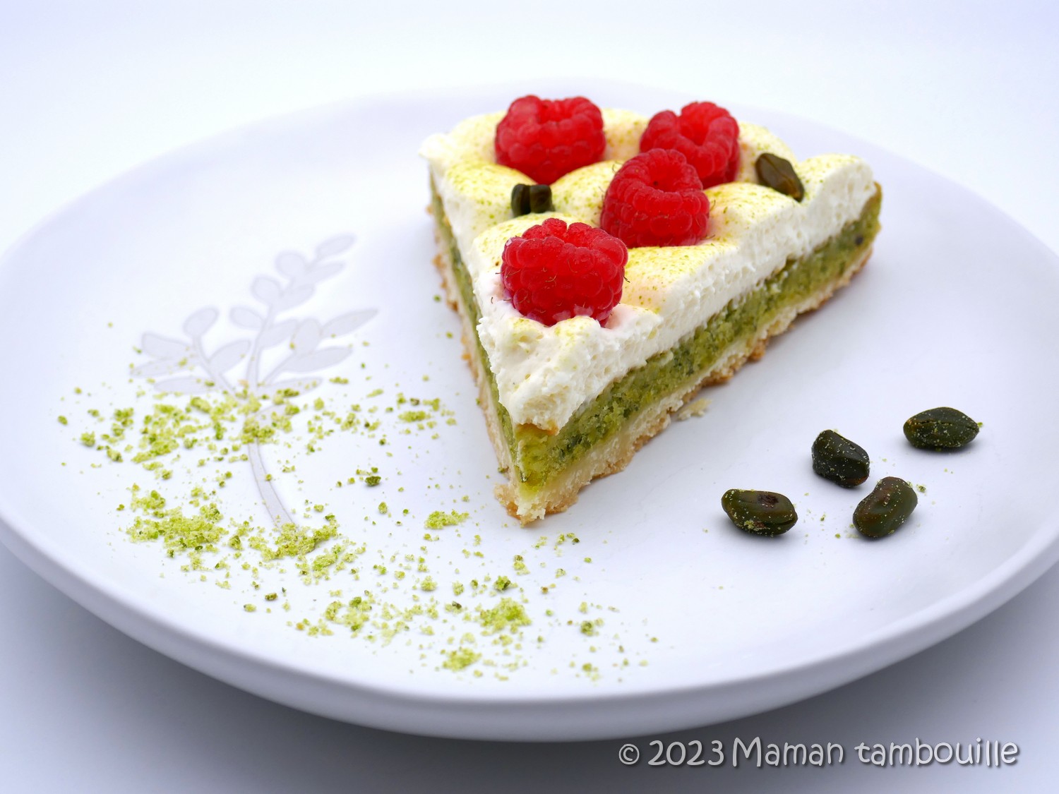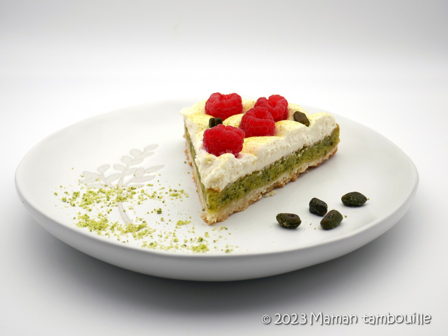 Je suis partie sur l’idée d’un fantastik avec: une base sablée, un biscuit moelleux à la pistache et imbibé d’un sirop fleur d’oranger, une ganache montée fleur d’oranger et enfin, quelque framboises fraîches pour la finition.