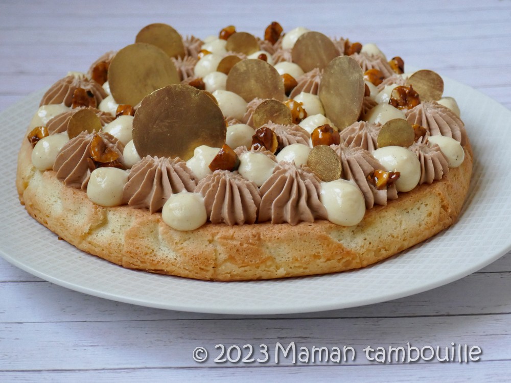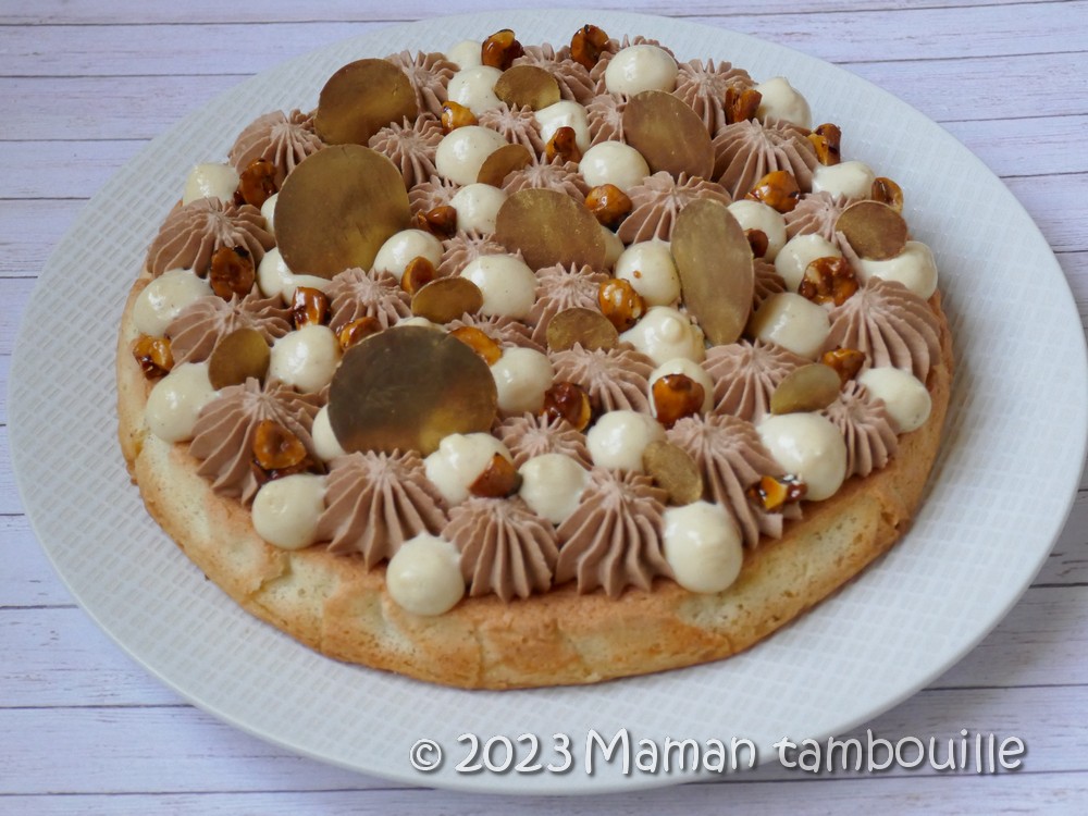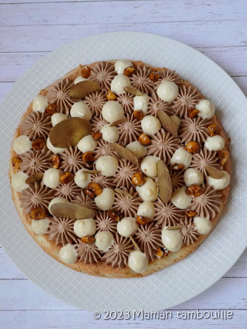 Un nouveau fantastik, cette fois, avec une ganache montée pralinoise et un crémeux vanille. Quelques noisettes caramélisées pour la gourmandise, quelques disques de chocolat doré pour le visuel et voilà !