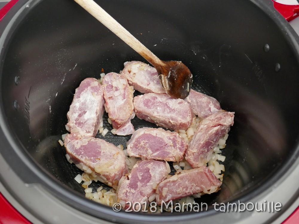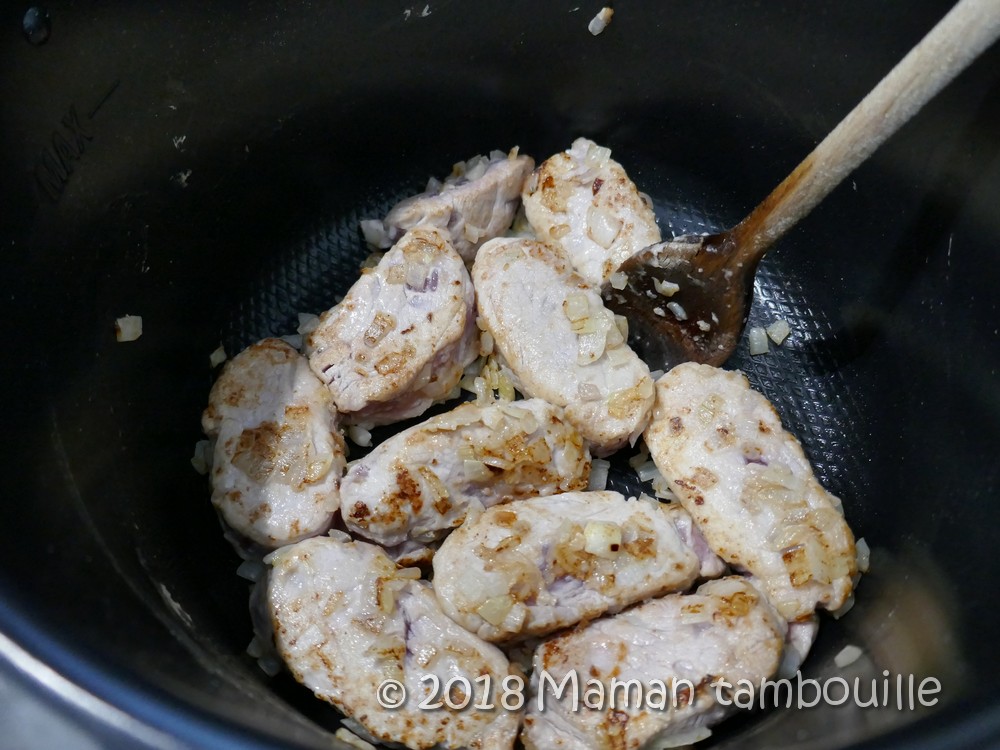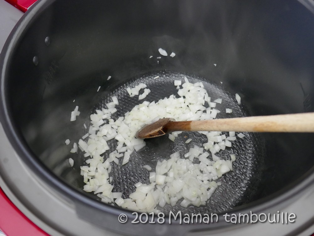 Mettre le cookeo en mode « dorer ». Ajouter une cuillère à soupe d’huile et y faire dorer les oignons 2 min en mélangeant (je n’attends pas la fin du préchauffage du mode « dorer » pour mettre mes oignons. Je les mets quand le préchauffage est environ à la moitié du temps).