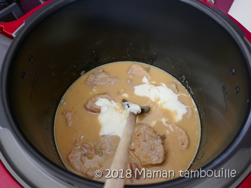 Au bout de 15 min, ouvrir le cookeo et mélanger. Ajouter la crème fraîche et mélanger.