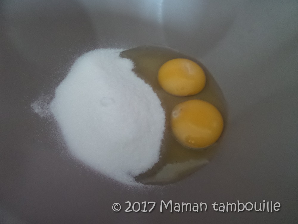 Dans un saladier, fouetter les œufs et le sucre jusqu’à ce que le mélange prenne du volume.