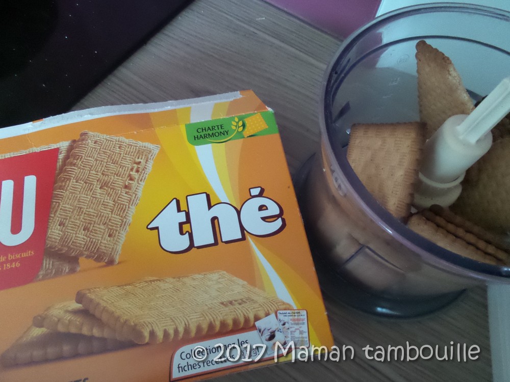 - 85g de biscuits secs (des biscuits « Thé » pour moi mais des petits beurre ou des speculoos feront l’affaire. Prenez ce que vous avez dans vos placards en fait.)