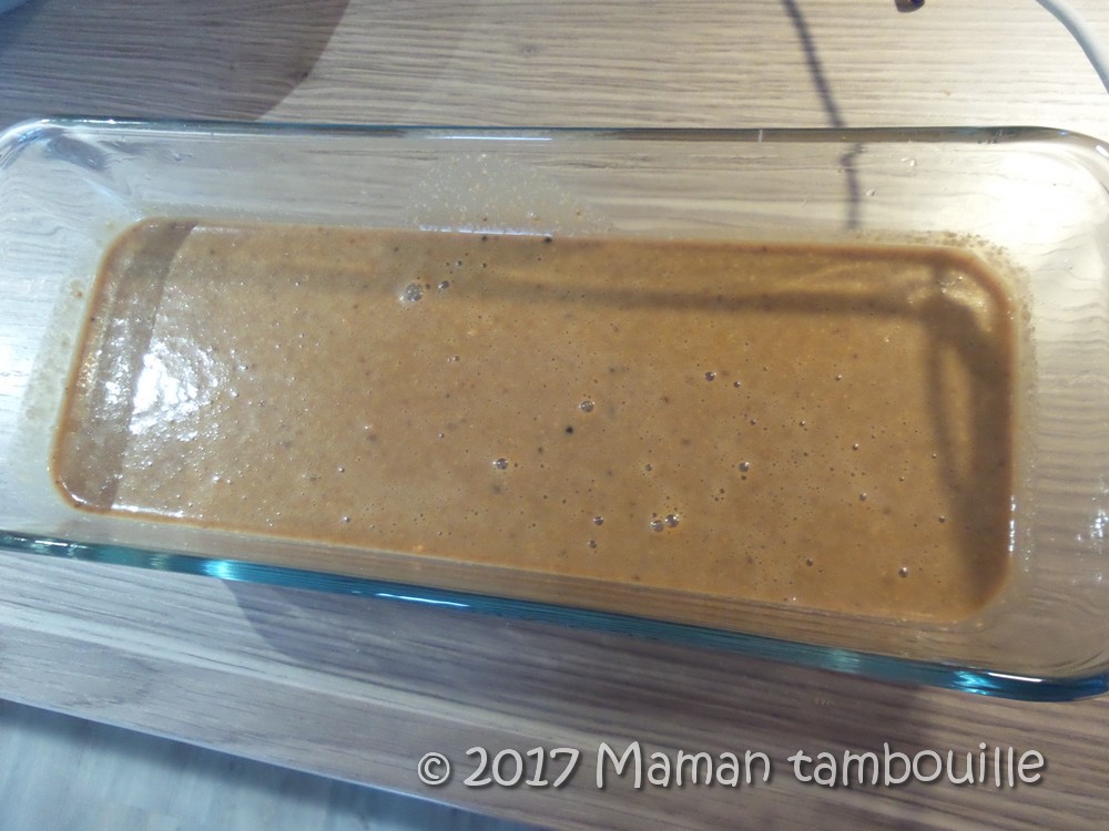 Verser dans un moule à cake en verre (ou en silicone, en tout cas, un moule qui passe au micro ondes).
