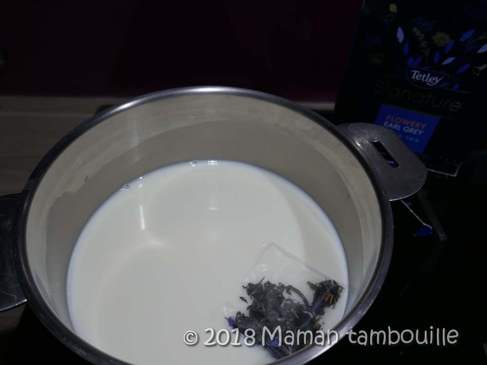 Quand la crème a épaissi, sortir le sachet de thé et le presser au maximum pour récupérer le plus de saveur possible.