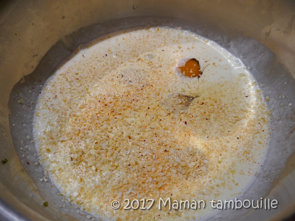 Dans un saladier, mélanger les œufs. Ajouter la crème, du sel, l’ail, l’oignon. Bien mélanger.