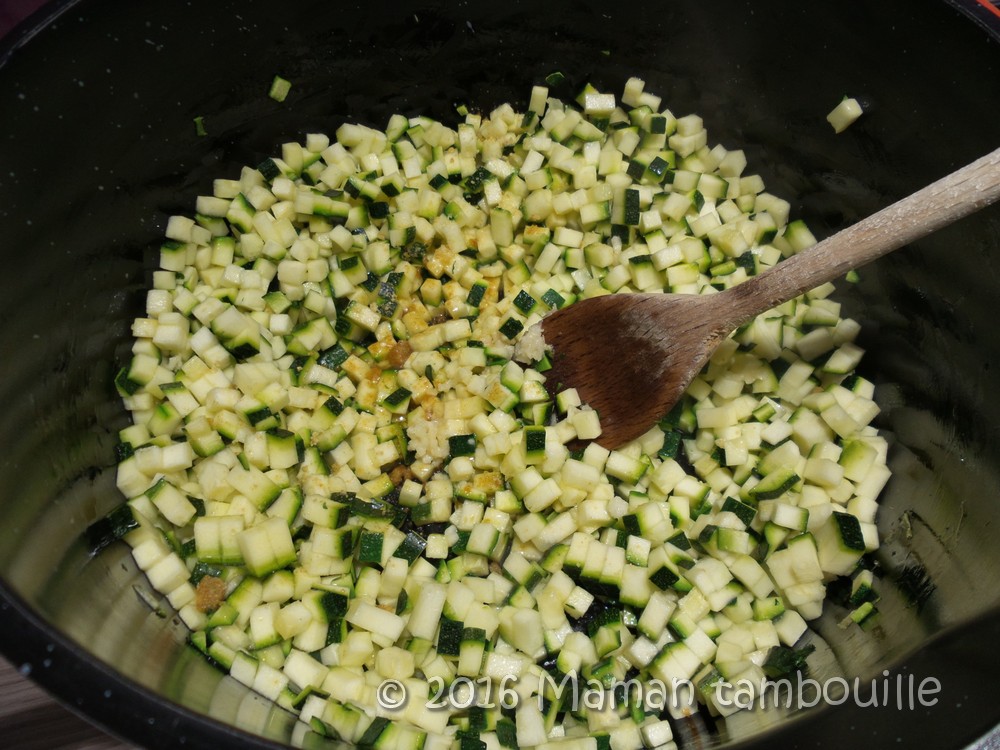Chauffer 3 cuillères à soupe d’huile d’olive et y mettre les dés de courgettes. Laisser revenir quelques minutes en mélangeant puis émietter le cube de bouillon et ajouter la gousse d’ail écrasée au presse-ail.