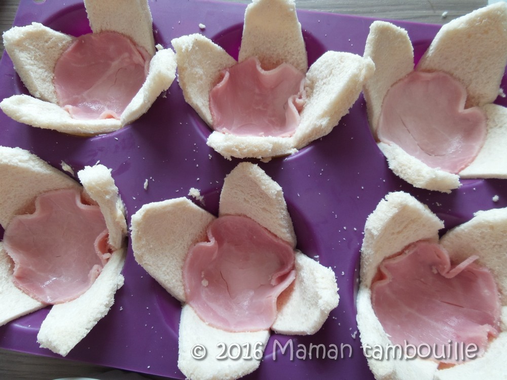 Couper des petits disques de jambon et les mettre dans le fond des fleurs (ça va donner une petite étanchéité et éviter que les courgettes ne détrempent le pain de mie).