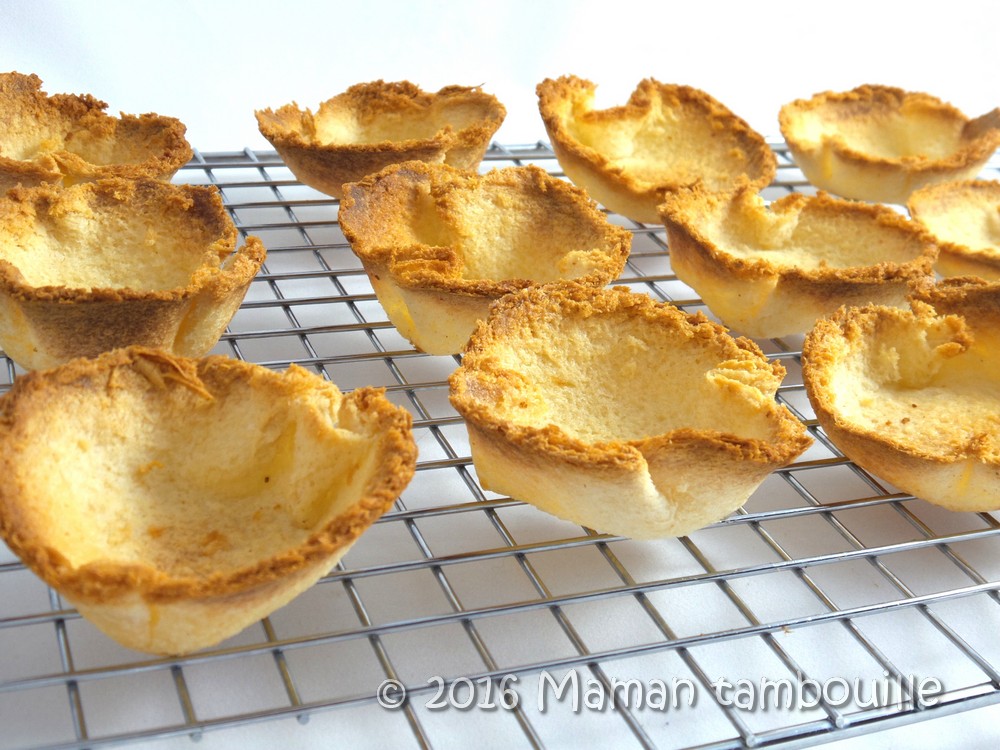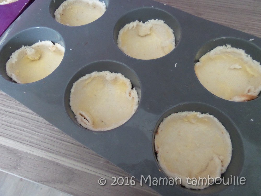 Enfoncer délicatement les ronds de pain de mie face beurrée au dessus dans des moules à muffin en silicone.
