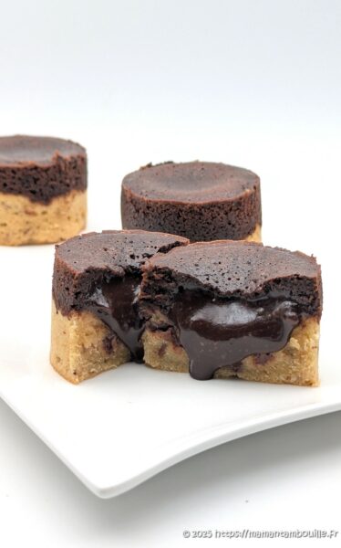 Enfourner 6 min à 200°, pas une minute de plus si on les veut bien coulants ! Pour les versions bouchées, plus petites, ne cuire que 5 min. Sortir du four et laisser tiédir 30 minutes avant de démouler. Servir encore tiède. Si vous les préparez avant, réchauffer 20 secondes au micro ondes avant de servir.