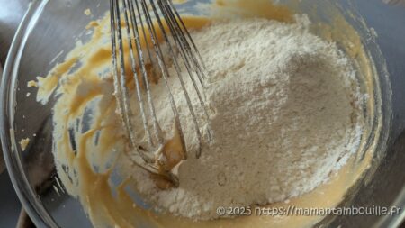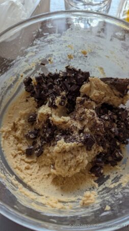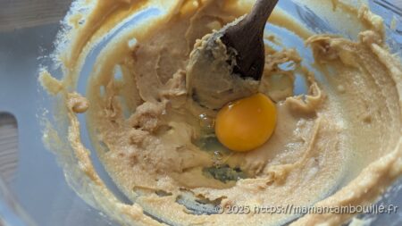 Préparer la pâte à cookies: Préchauffer le four à 180°. Faire ramollir le beurre au micro ondes (il doit être bien mou mais pas liquide). Ajouter la vergeoise et bien mélanger. Ajouter l’oeuf et mélanger.