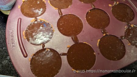Graisser des cercles de 6 cm de diamètre. (J’en ai fait 4 et j’ai fait le reste dans un moule de 12 empreintes plus petites pour faire des formats « bouchées »). Mettre environ 1 à 1,5 cm d’épaisseur de pâte à cookie dans le fond et tasser.