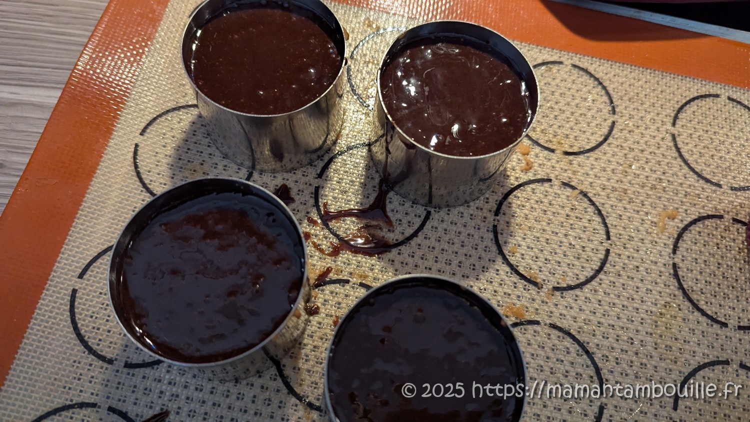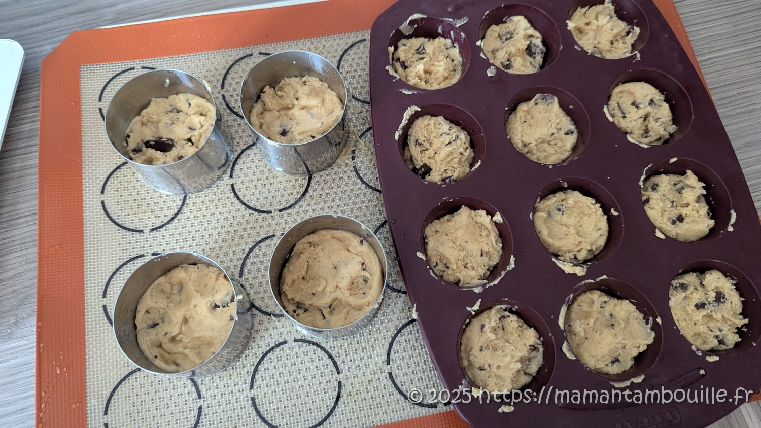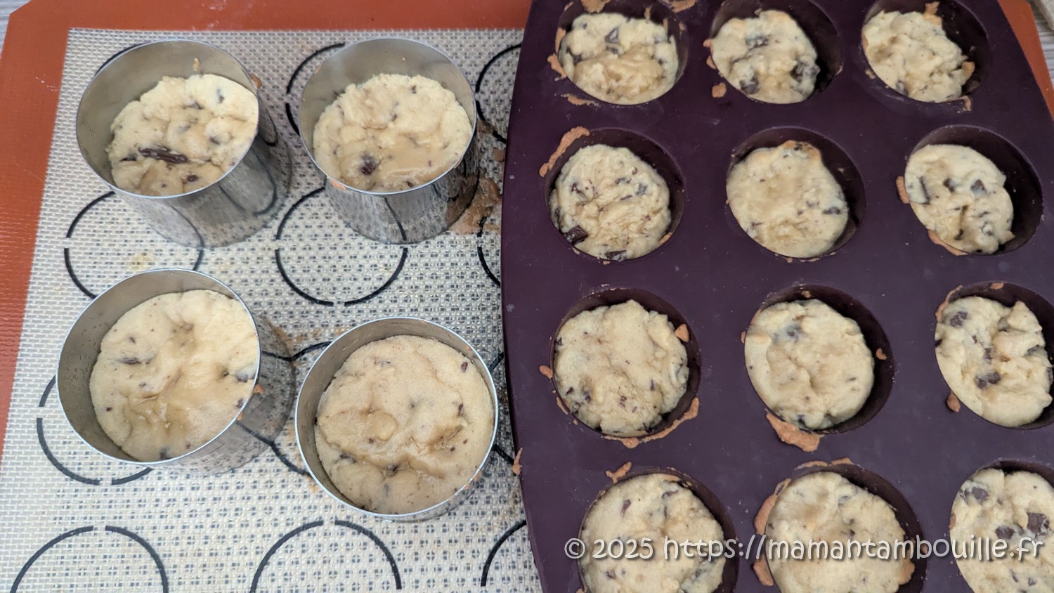 Graisser des cercles de 6 cm de diamètre. (J’en ai fait 4 et j’ai fait le reste dans un moule de 12 empreintes plus petites pour faire des formats « bouchées »). Mettre environ 1 à 1,5 cm d’épaisseur de pâte à cookie dans le fond et tasser.