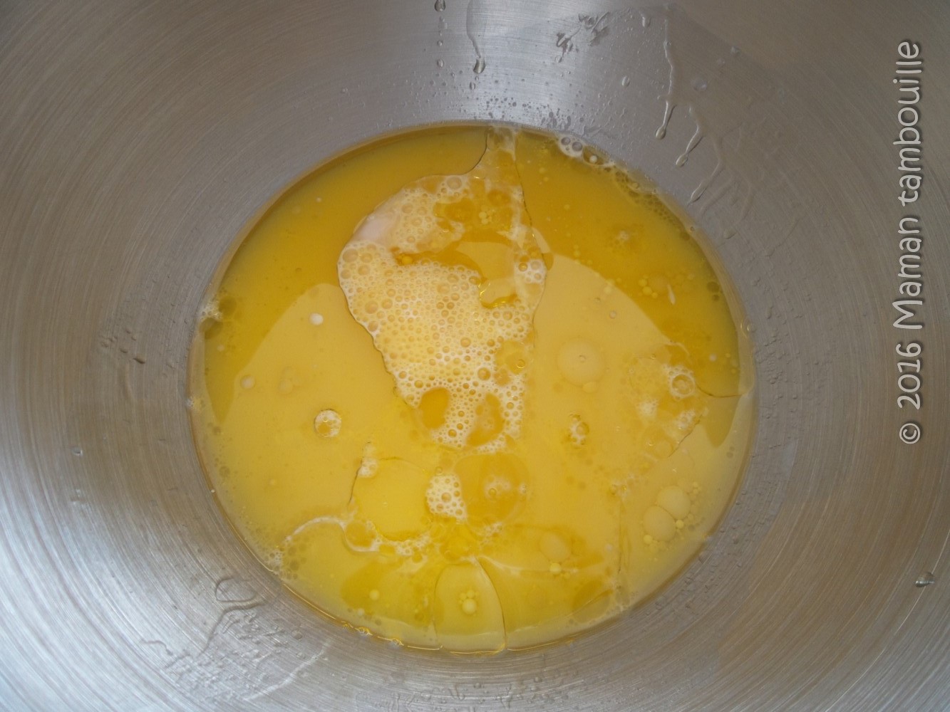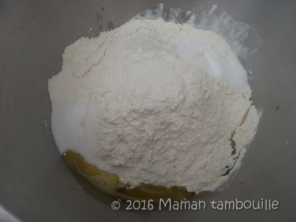 Dans le bol d’un robot pétrin, mettre les œufs, la levure avec l’eau, l’huile d’olive et le lait.