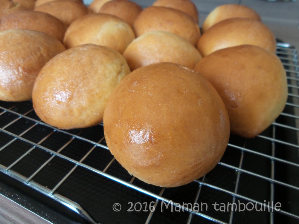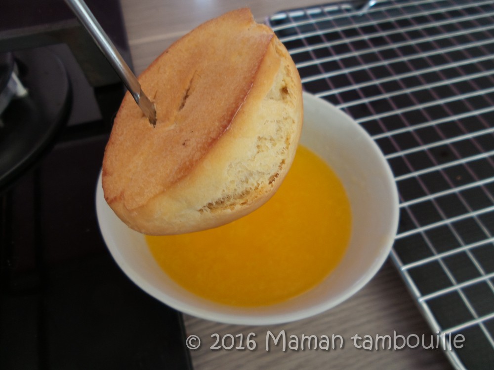 Faire fondre du beurre dans un petit bol. Piquer les petits pains par le dessous dès la sortie du four et les plonger dans le beurre fondu (pour apporter aux petits pains le côté gourmand de la friture).