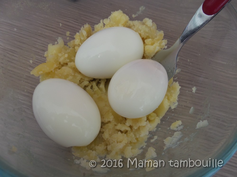 Cuire les pommes de terre épluchées. Les écraser à la fourchette dans un plat. Ajouter les œufs et les écraser.