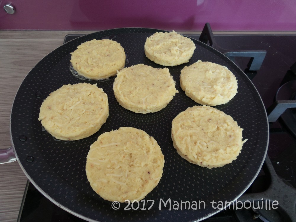 Prélever des boules de pâtes et les façonner en galette plate (j’ai utilisé un emporte pièce de 7 cm pour avoir des galettes identiques.).