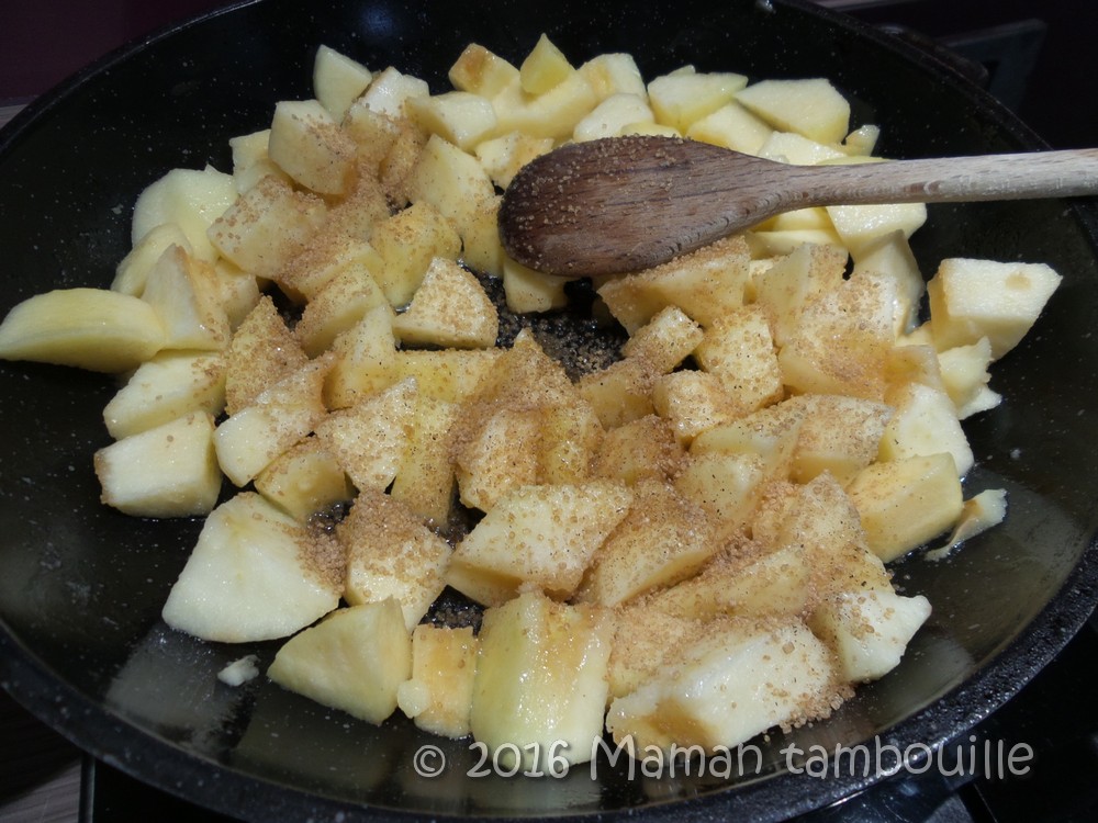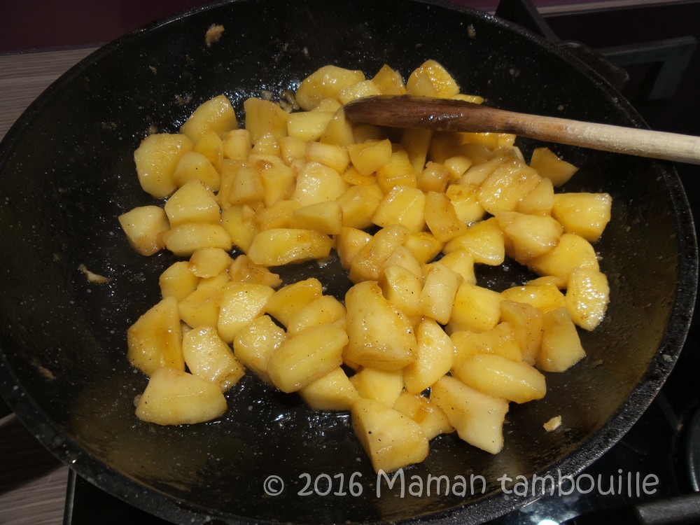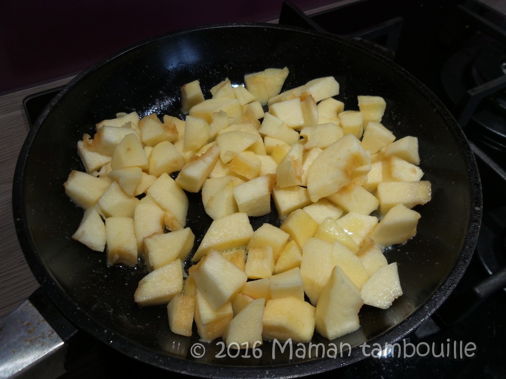 Faire fondre 20g de beurre dans une poêle. Y ajouter les dés de pommes et mélanger.