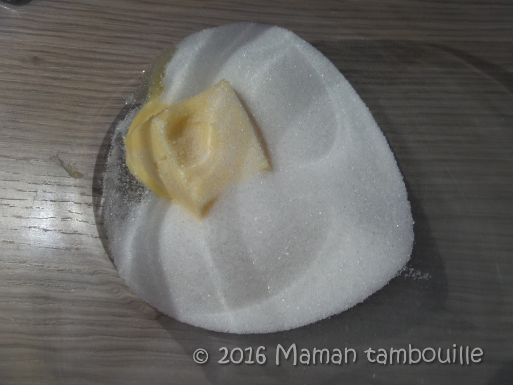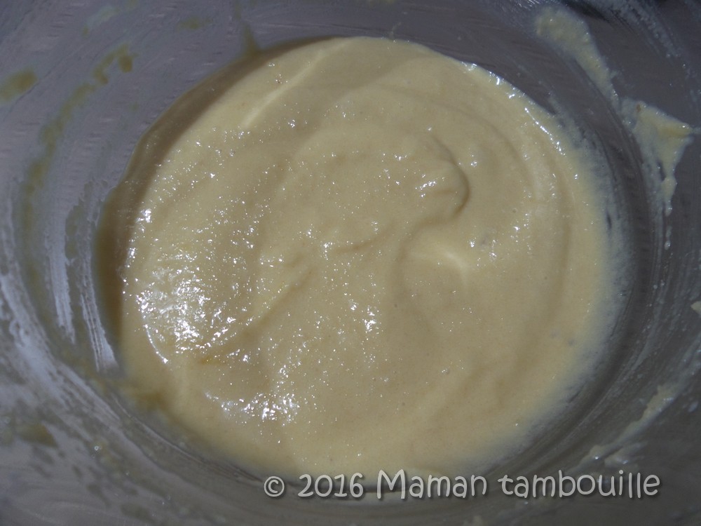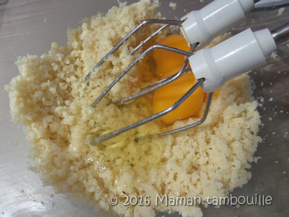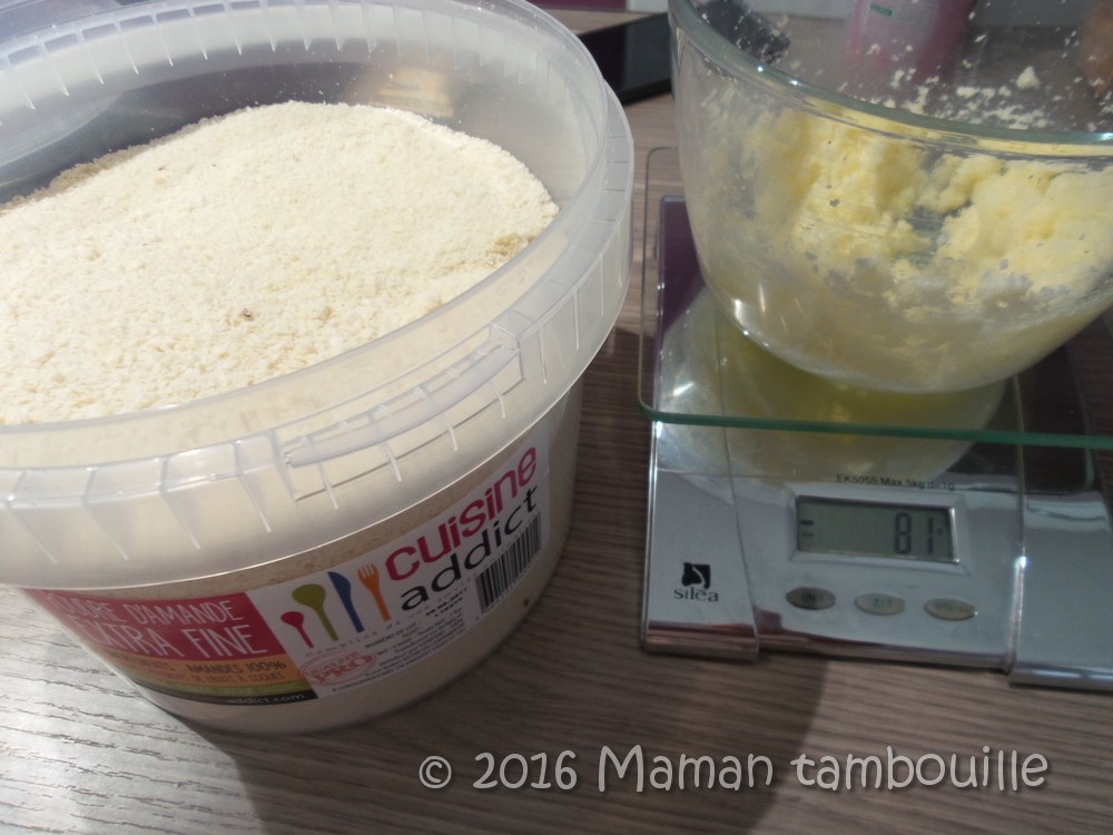Fouetter au batteur pour crémer le beurre. Ajouter la poudre d’amande.