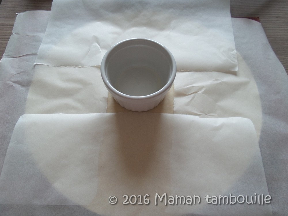 Poser un ramequin au milieu et des rectangles de papier cuisson autour du ramequin pour couvrir toute la pâte.