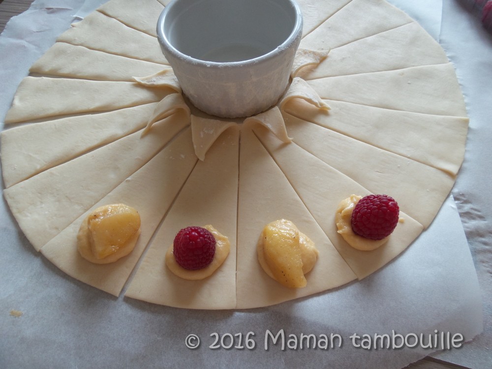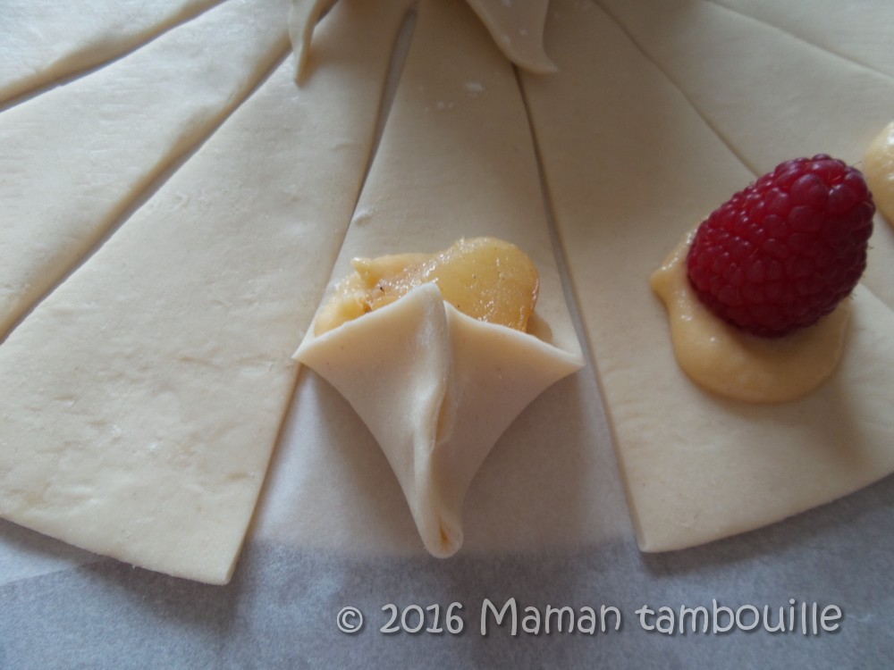Déposer une petite cuillère de crème d’amande sur chaque bande et un morceau de pomme ou une framboise en alternance.