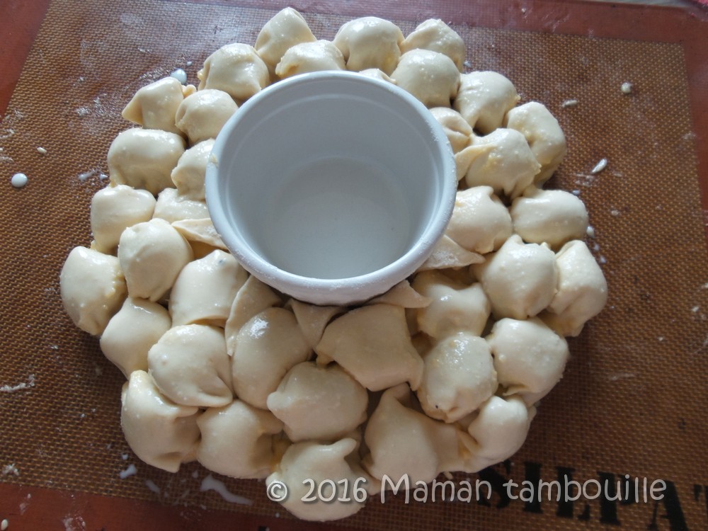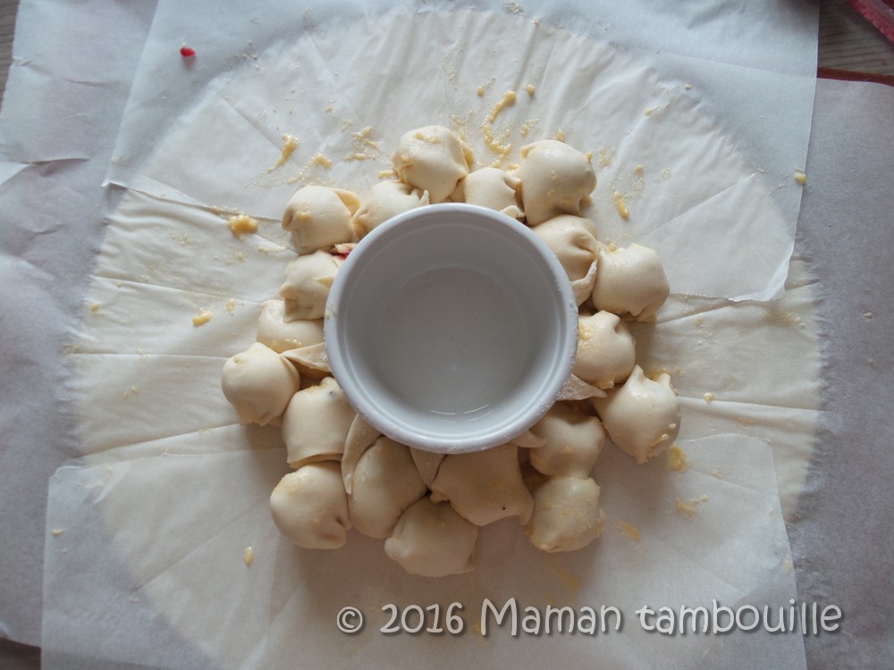 Rouler une boule sur 2 le plus près du ramequin pour faire une 1ère rangée puis les autres boules sur une 2ème rangée.