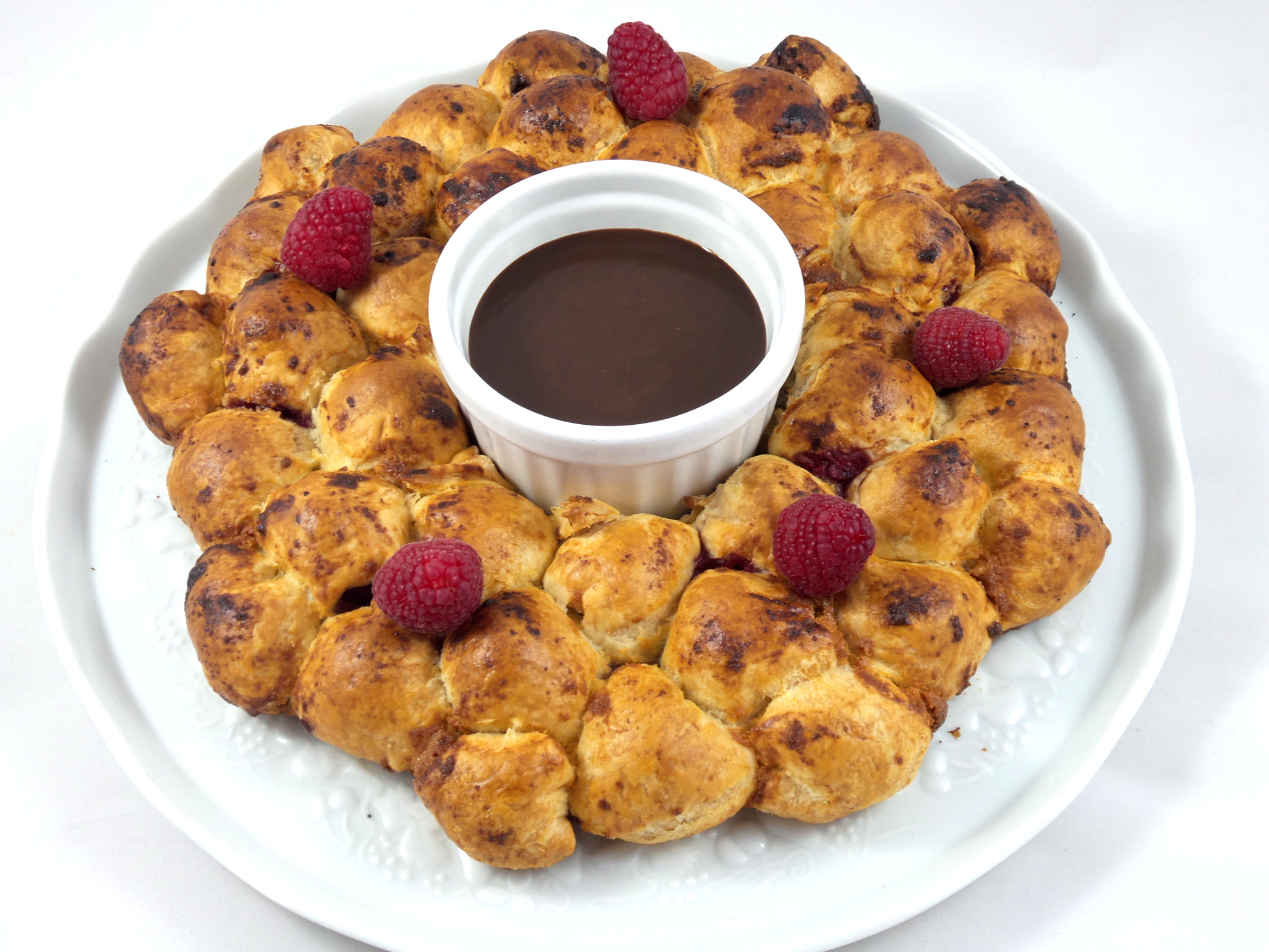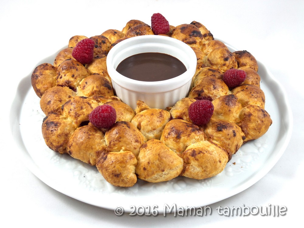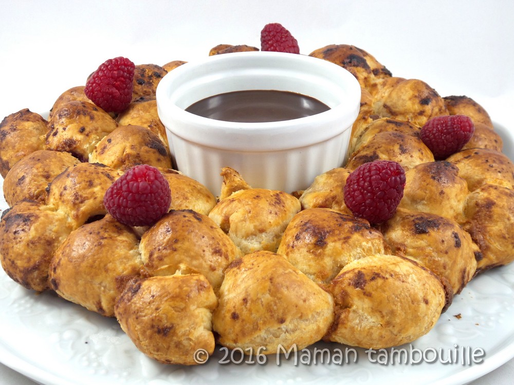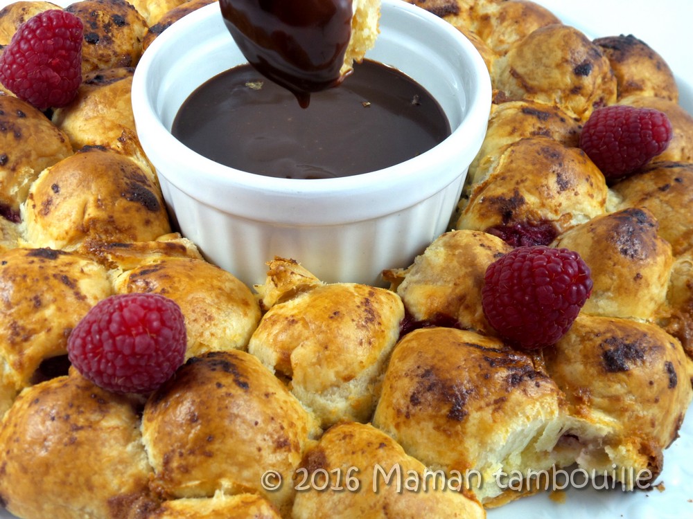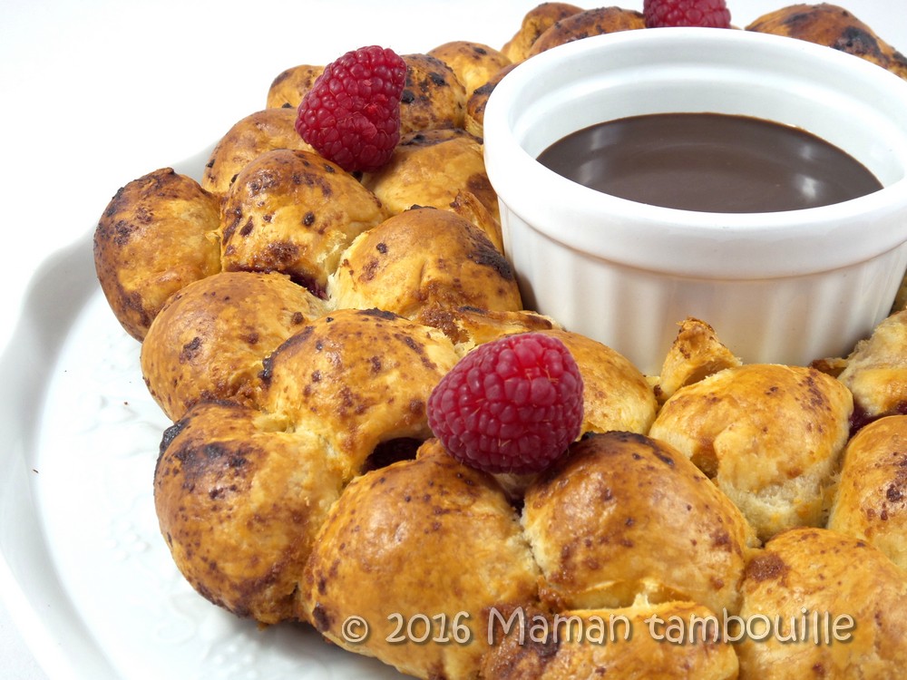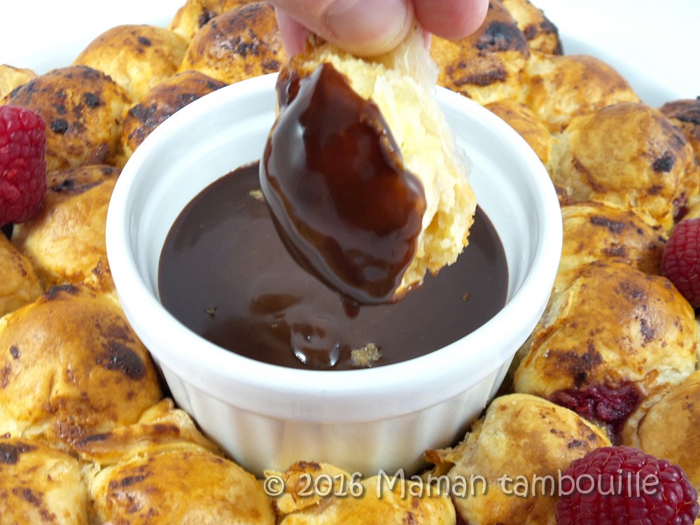 Pour la garniture des boules, un peu de crème d’amande pour rester dans l’esprit frangipane ainsi qu’un morceau de pomme cuite ou une framboise selon les boules ! Bien sûr, une des boules contient la fève ;-). Pour déguster, chacun prélève une boule et la trempe dans un mélange de chocolat/pralinoise pour une gourmandise maximale !