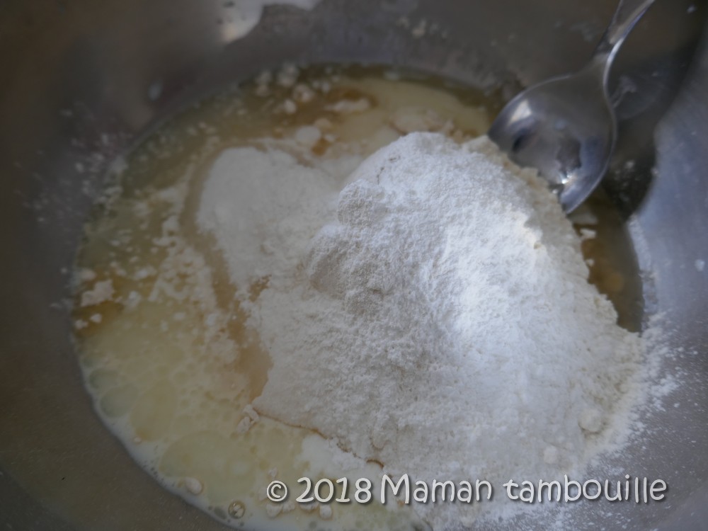 Ajouter la farine tamisée, la levure, le sucre et du sel. Mélanger au fouet jusqu’à avoir une belle pâte lisse (sinon, on peut faire au robot aussi 😉 ).