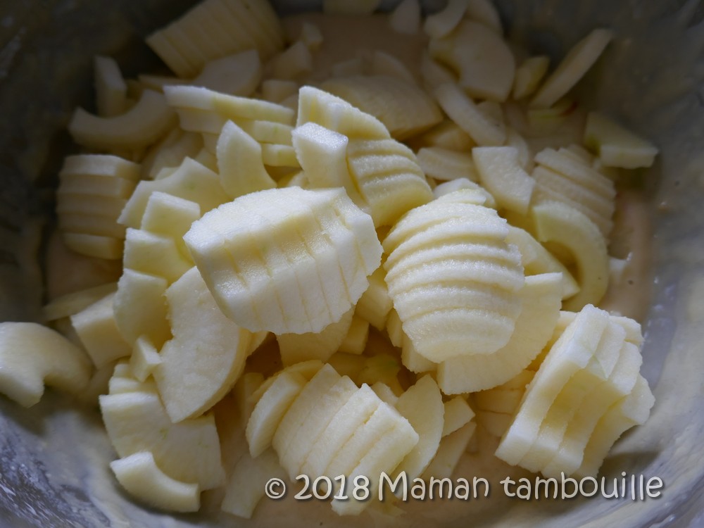 J’ai beaucoup de pommes en stock alors j’ai fait un gâteau aux pommes pour en écouler quelques unes. J’ai trouvé la recette ICI. J’ai juste remplacé le rhum par de la fleur d’oranger (et adapté le dosage en cuillères à soupe qui me perturbait un peu par un dosage en gramme).