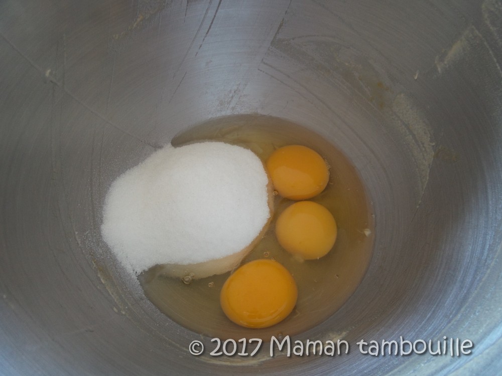 Dans un saladier, mettre le sucre et les œufs. Fouetter jusqu’à ce que ça double de volume.