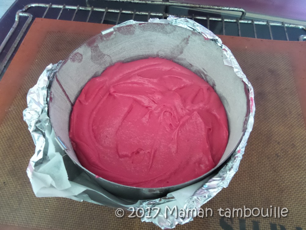 Faire de même avec le petit gâteau. Le mien était trop bombé alors j’ai coupé la partie bombée pour avoir un gâteau plat.