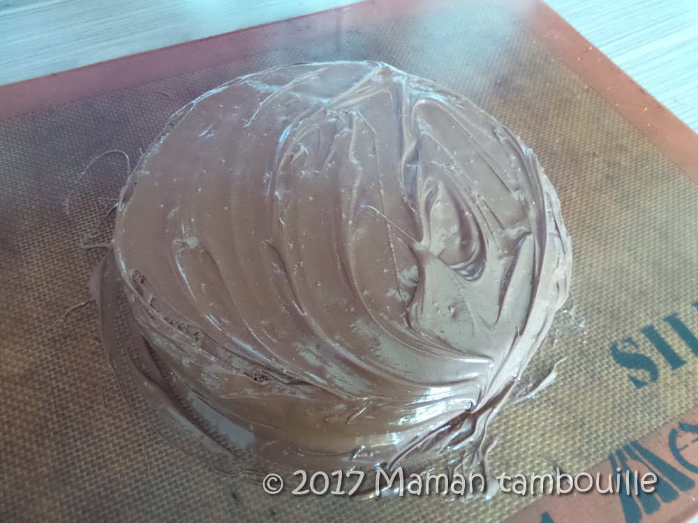 Tartiner l’intérieur de pâte à tartiner (mettre le pot au bain marie 5 min avant de commencer pour ramollir le chocolat). Refermer le gâteau et tartiner le dessus et les côtés.