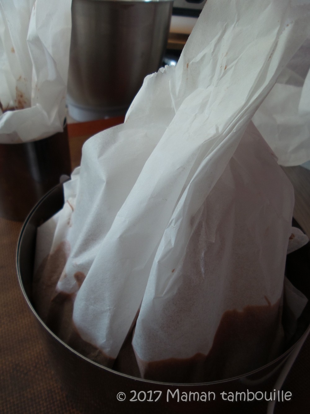Préparer 2 cercles à pâtisserie sur une plaque de cuisson: un cercle de 16cm environ et un autre de 8cm. Les couvrir avec une grande feuille de papier cuisson qui dépasse en hauteur.